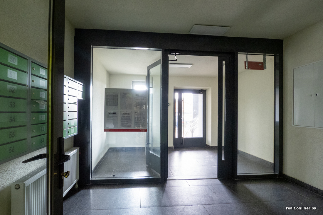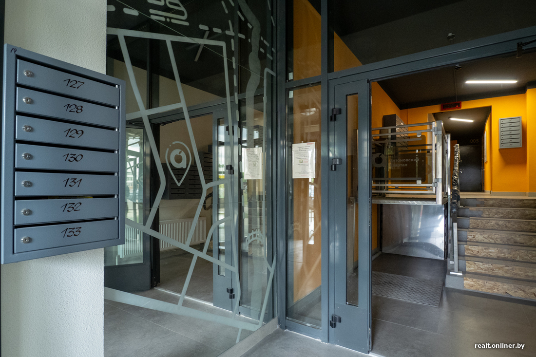 Подъезды выглядят приятно, много стекла, есть подъемники для людей с ограниченными возможностями. Рядом с домами — велобоксы.