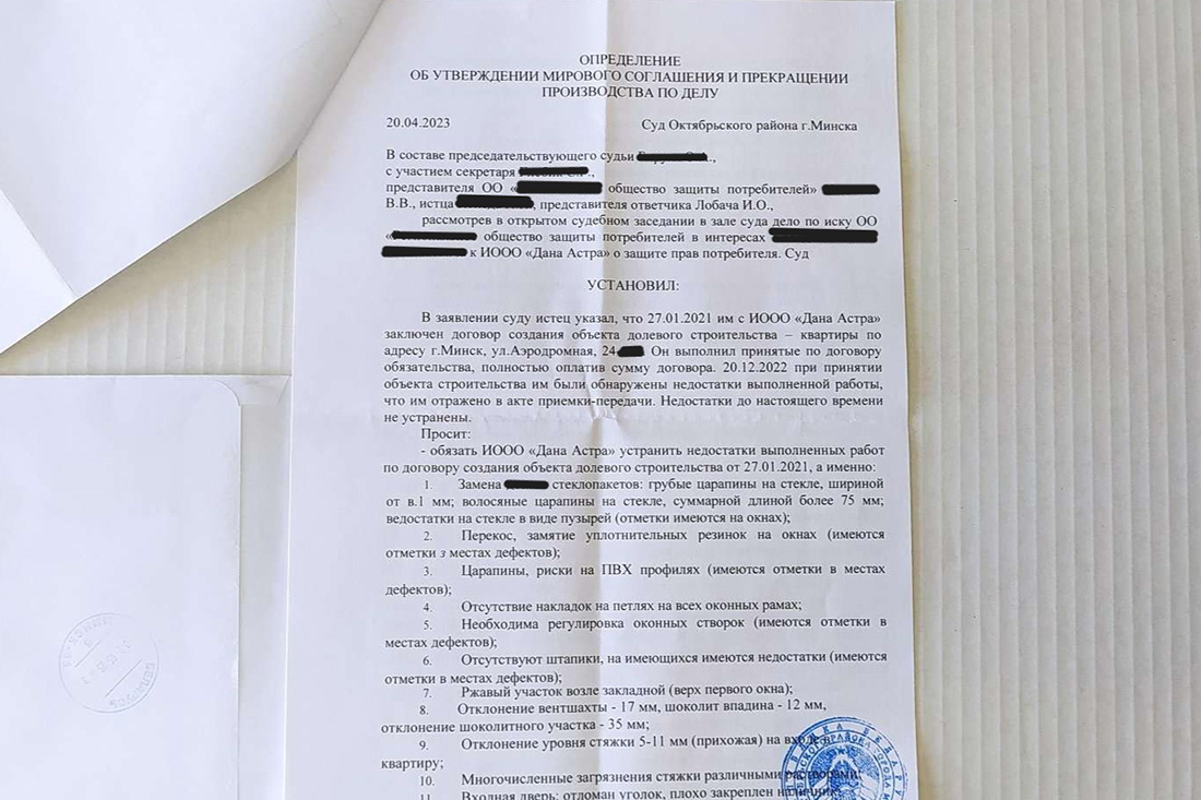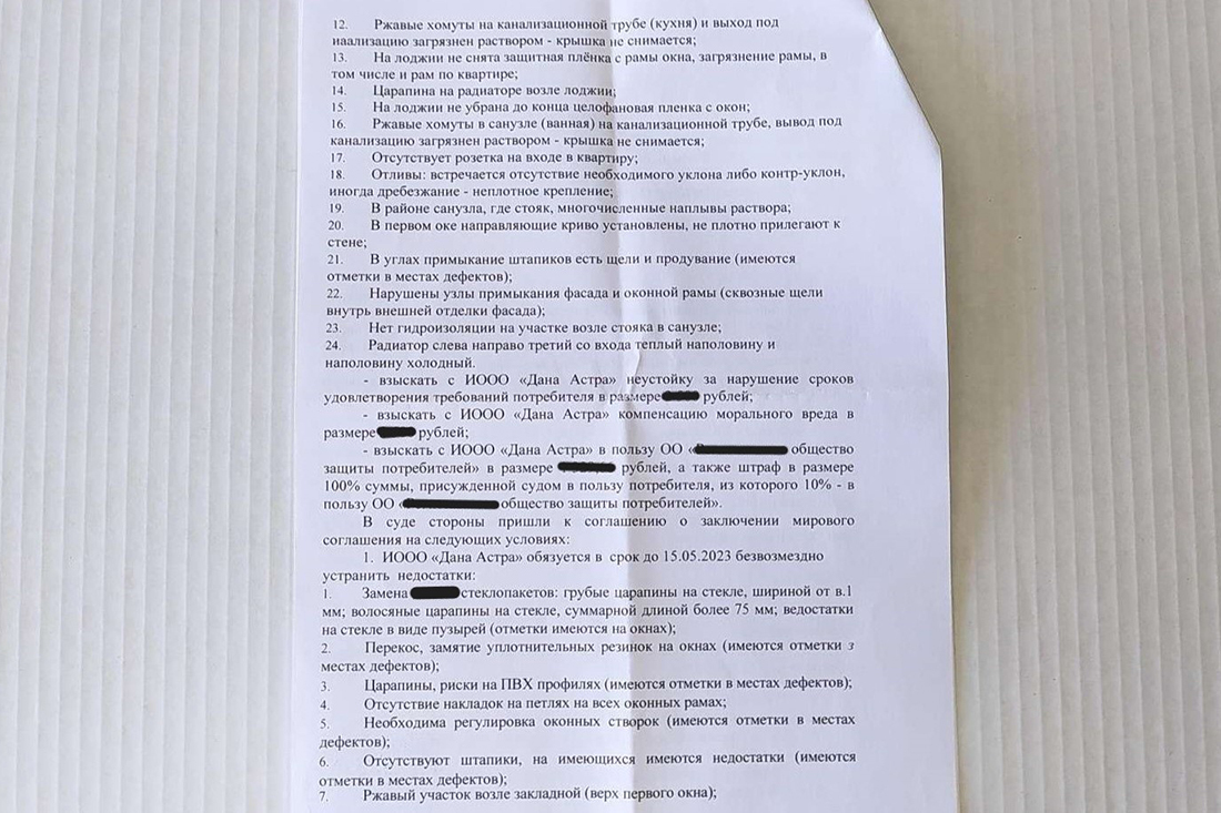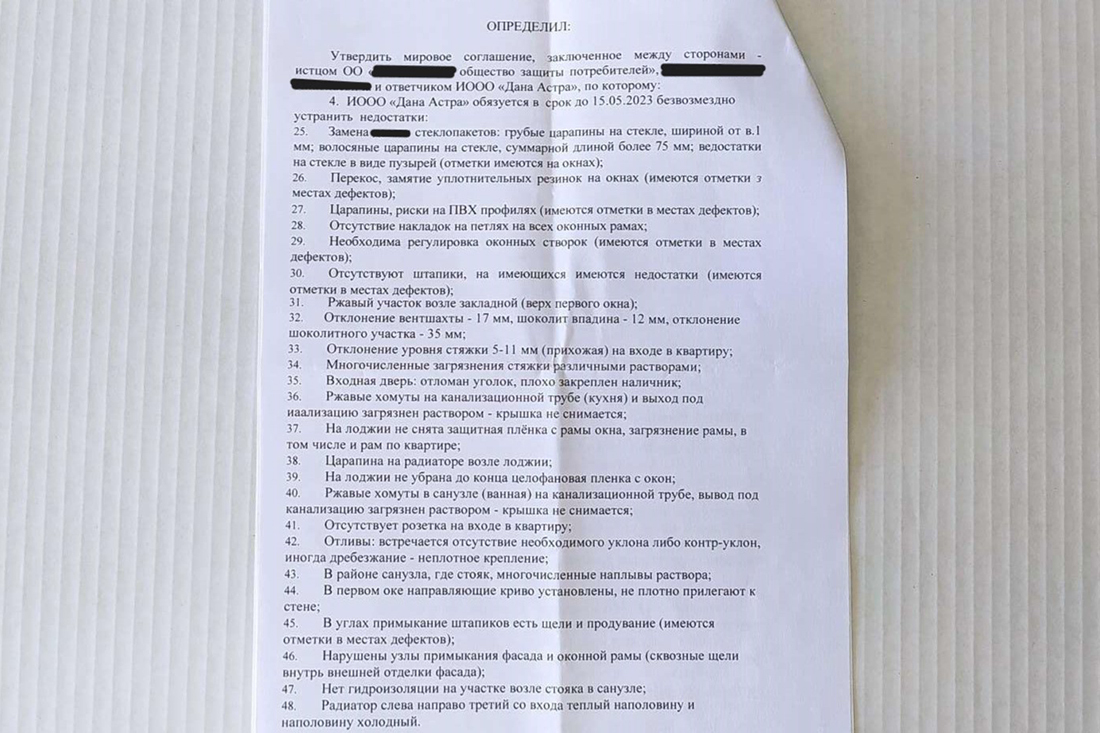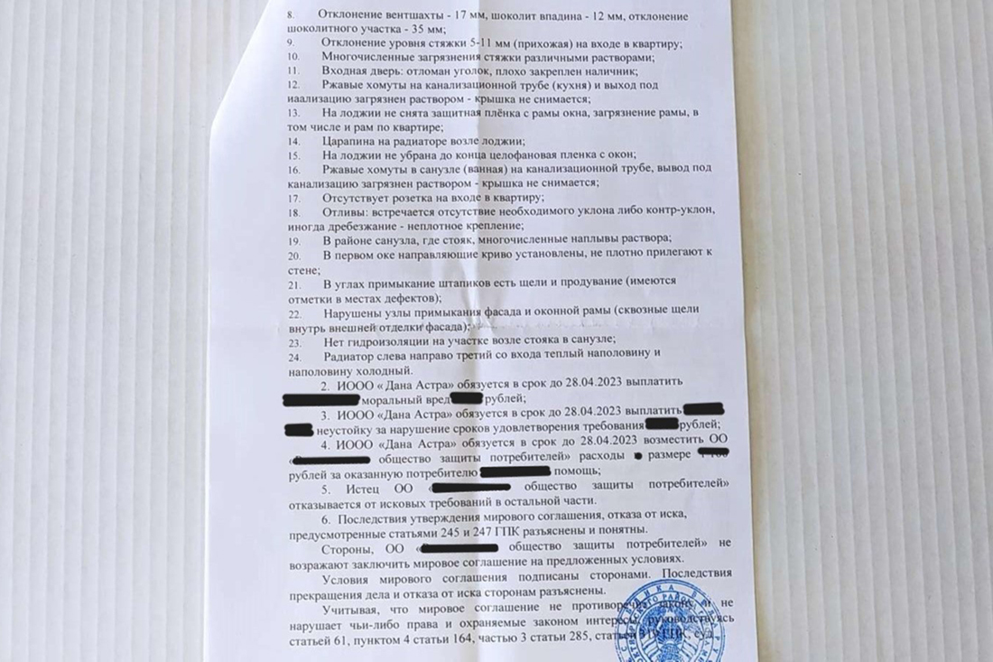 После очередных переговоров в зале суда со второй стороной мы пришли к решению заключить мировое соглашение: застройщик выплачивает мне компенсацию, покрывает расходы на работу общества защиты прав потребителей и за две недели исправляет недостатки.