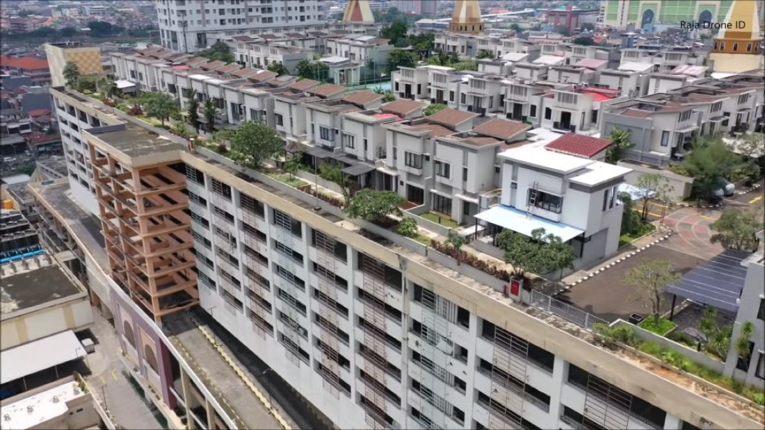 Симпатичные двухэтажные коттеджи, припаркованные возле них автомобили, небольшие лужайки, теннисный корт, бассейн — все это кажется обычным респектабельным пригородом, которые бывают у крупных и не очень населенных пунктов. Действительность же, мягко говоря, удивляет. Все это находится на крыше десятиэтажного торгового центра в самом сердце одного из самых густонаселенных мегаполисов планеты. Фотографии жилого квартала Cosmo Park в индонезийской Джакарте стали вирусными, ведь они немедленно вызывают очень много вопросов. Как вообще там живут люди? Насколько это безопасно? Законно ли это? Чего хотел добиться застройщик? И, главное, зачем было так оригинальничать? Отвечаем на все из них.