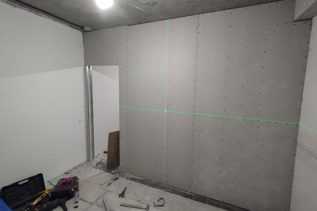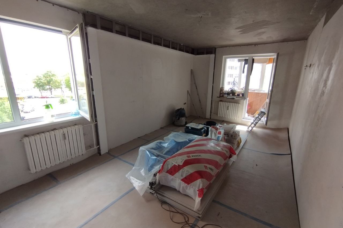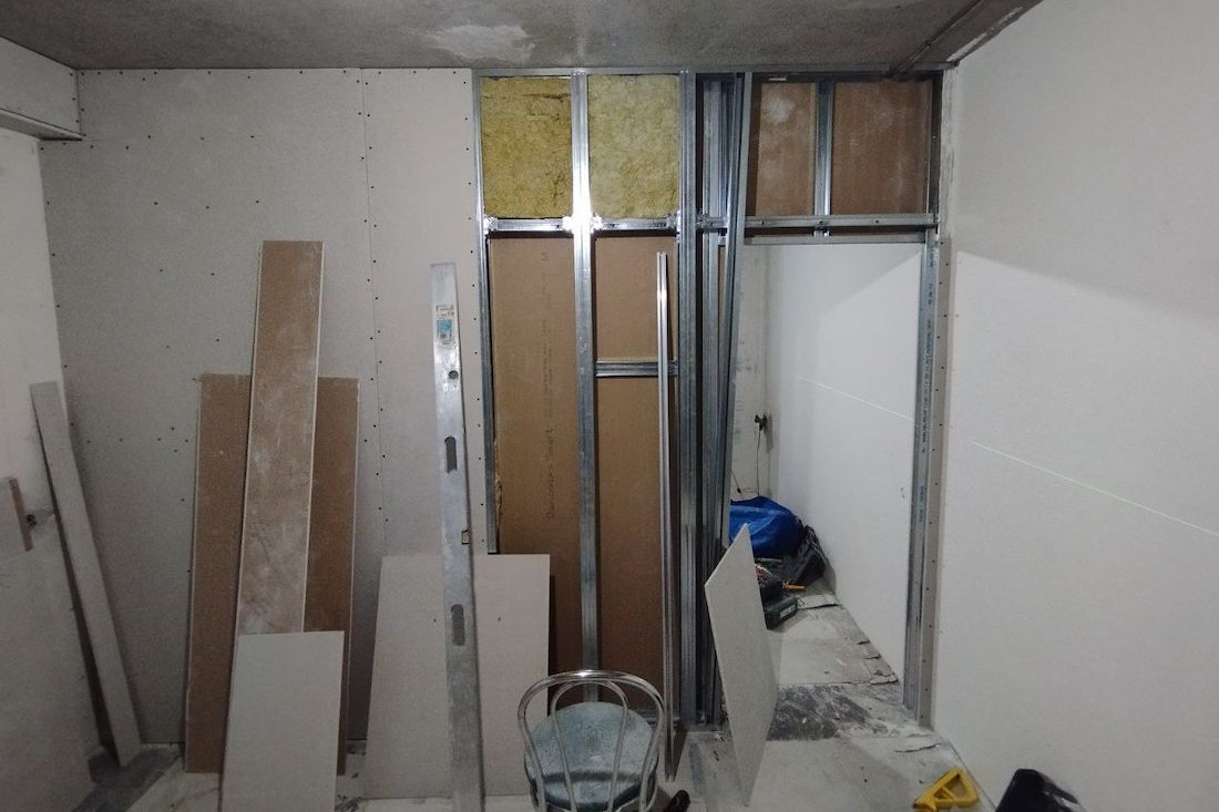 За работу мастер насчитал $1400. В эту сумму входили демонтаж старых гипсокартонных конструкций, монтаж гипсокартонной перегородки толщиной 15 см, разводка электрики, подготовка стен (с частичным оштукатуриванием) и наклеивание обоев. Материалы минчане должны были покупать самостоятельно. Сроки прораб обозначил довольно сжатые — 10 календарных дней (с 12 по 22 июня). Но ведь и комната небольшая…