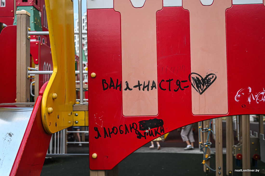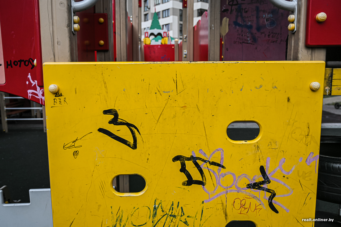 В «Маяке Минска» есть огромная детская площадка с горками-лазалками, которую знают многие. Ее еще называют «Кремль» из-за характерных башенок. Район новый, площадка тоже молодая, но по виду уже и не скажешь. Горка так исписана каракулями и ругательствами, что живого места не найти. Местные ломают голову, как реанимировать зону отдыха, с этой проблемой они обратились в редакцию Onlíner.
