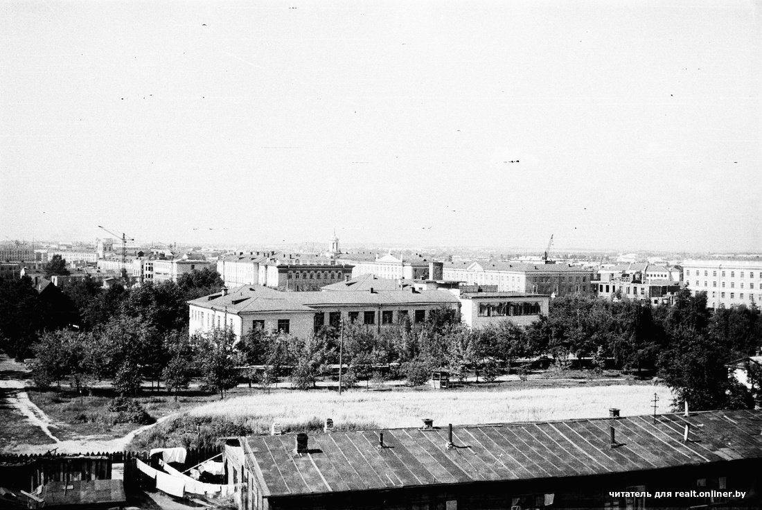 Паглядзіце, як выглядаў раён галоўнага корпуса БПІ, зараз — БНТУ. Амаль насупраць, на адлегласці, стаяў драўляны барак. Чытач мяркуе, што менавіта там маглі жыць ягоныя бацькі: