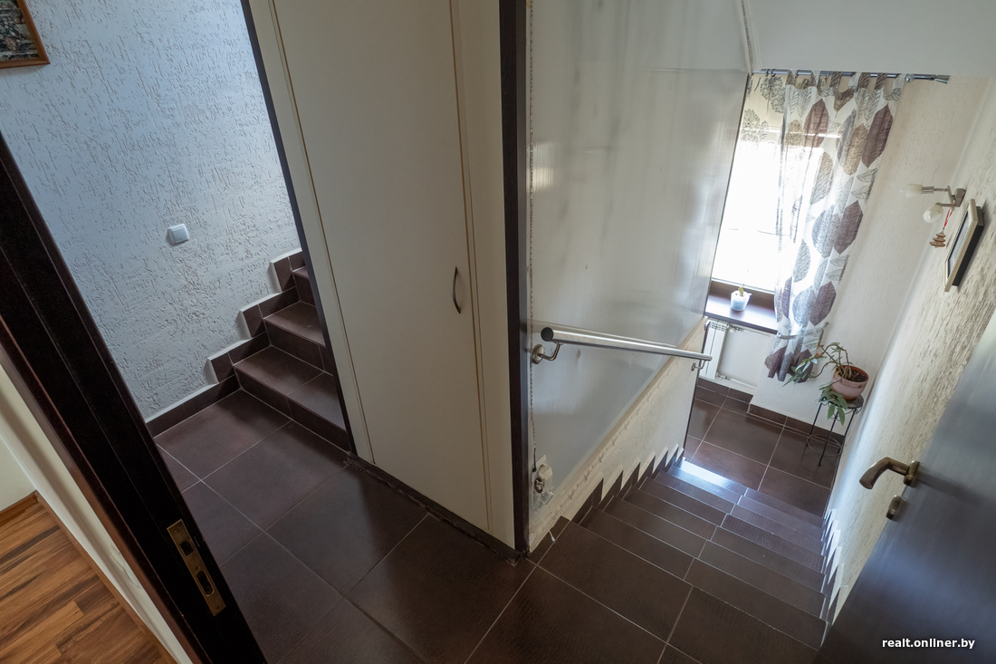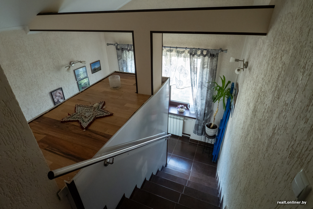 Но, пожалуй, самое интересное — это то, что в доме можно установить персональный лифт. Лестница сконструирована таким образом, что внутри нее заключена шахта. Сейчас в ней размещены кладовки, но хозяева признаются, что давно мечтали установить передвижную платформу. Правда, так и не добрались до этого этапа — все же удовольствие недешевое.