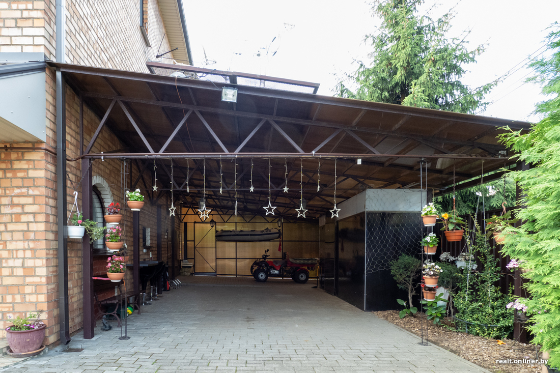 Зона для барбекю тоже на месте. А еще — огромный навес, под которым поместится шесть машин (если у вас, конечно, столько есть). В цокольном этаже расположена небольшая мастерская, которую можно перепрофилировать в сауну.