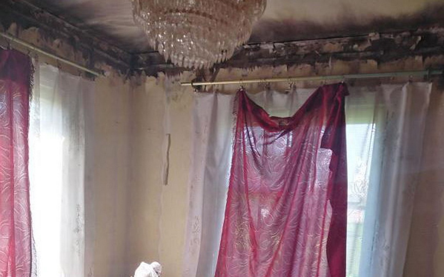 Вещи поскидывало на пол, обои испорчены, потолок теперь черный, тюли и шторы разорваны.