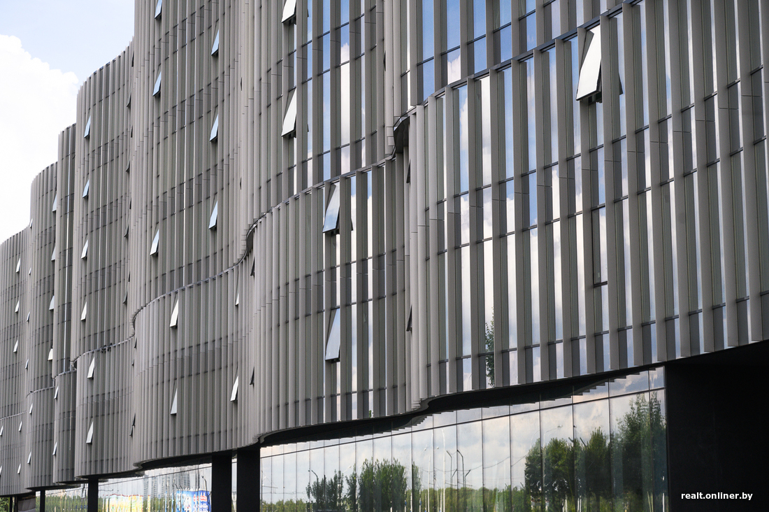 — Первоначальный проект действительно пересмотрели, кардинально изменив все ранее предложенные архитектурные решения и инженерное обеспечение, — говорит замдиректора по строительству. — Облик объекта формируют две независимые волны. Игру теней и стереоэффект создают анодированные ламели — обработанный специальным образом металл. За счет этого достигается современная и эффектная игра цвета на фасаде.