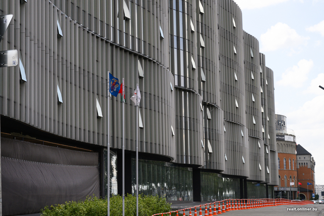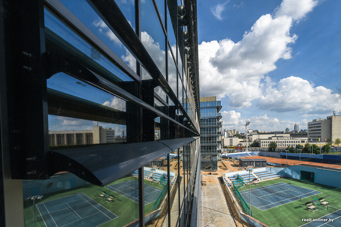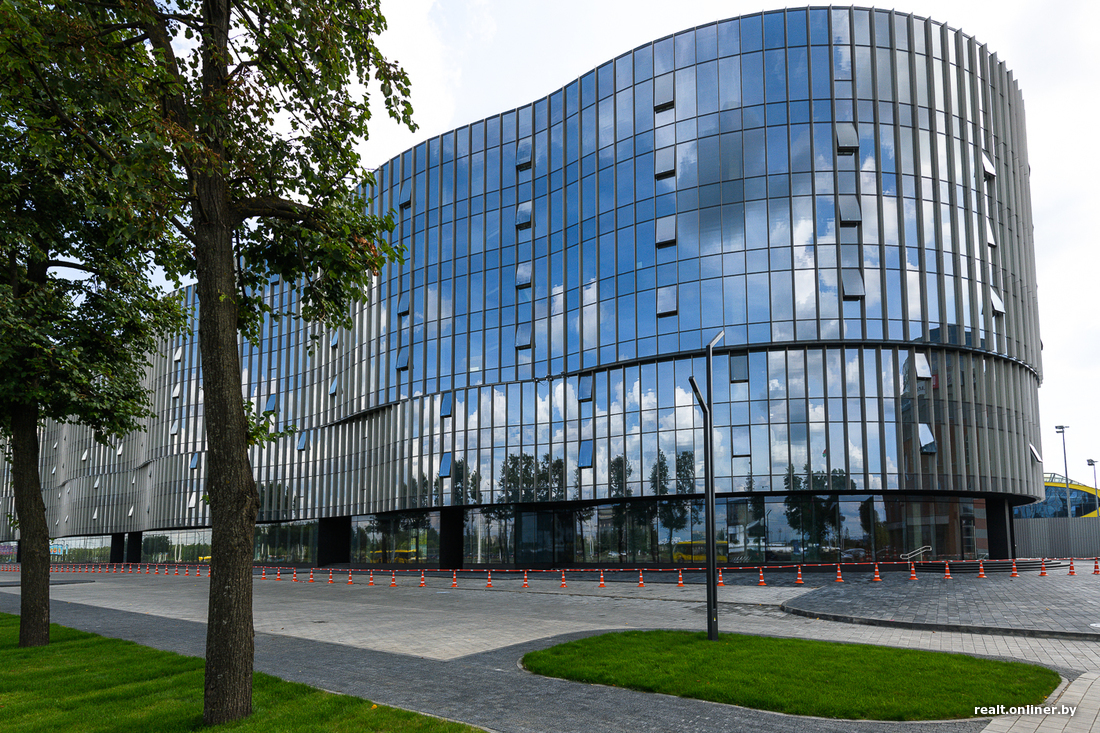 На проспекте Победителей за последний год выросло масштабное стеклянное здание. Выглядит оно необычно: этакая длинная волна, за которой, кстати, прячутся теннисные корты. Работы над новым комплексом уже заканчивают. Onlíner побывал внутри, рассмотрел объект в подробностях и узнал, что здесь будет.