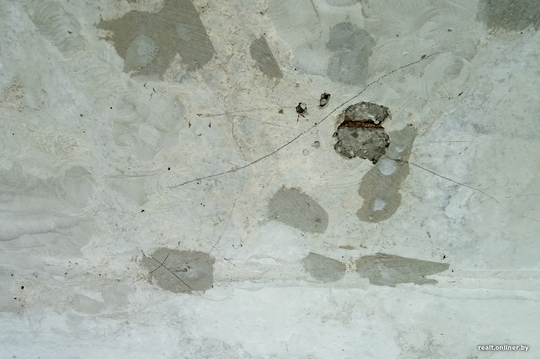 Сразу в нескольких местах наружный слой плиты перекрытия оказался «хрупким». «Мы хоть и имеем монолитное перекрытие, но выглядит оно очень странно: поверхность как будто рыхлая, со множеством „раковин“. Да и цвет не тот — какой-то желтоватый. Не скажу, из-за чего именно так произошло, но нижний слой бетона легко „отщелкивается“: под ним видна голая ржавая арматура. И такие очаги есть по всей квартире: где-то они больше, где-то меньше. Бетон достаточно мягкий, что видно даже по шлифовке. И вот с этим застройщику предстоит изрядно поработать», — объяснял весной Александр Скок.