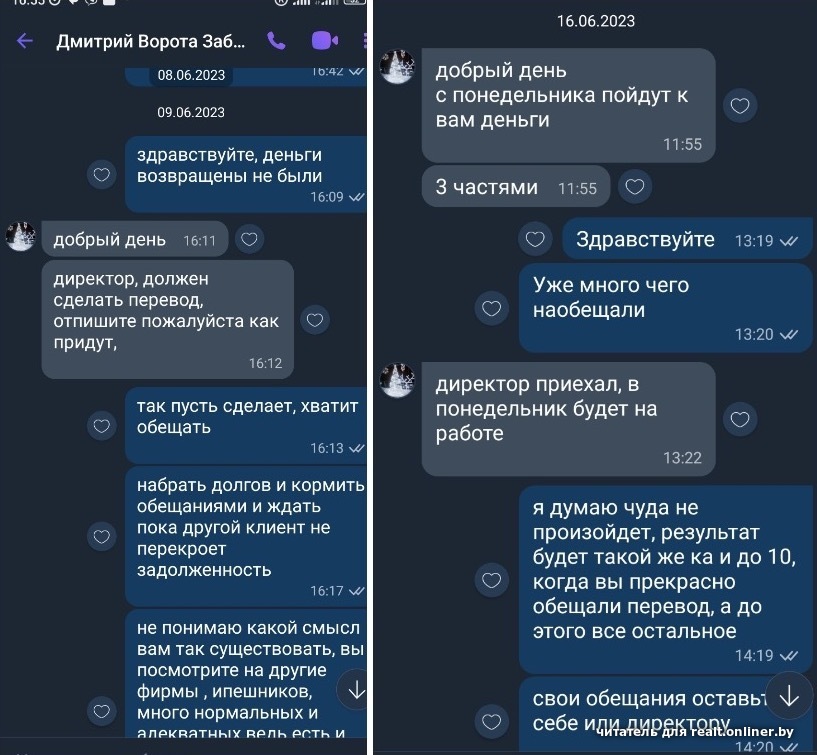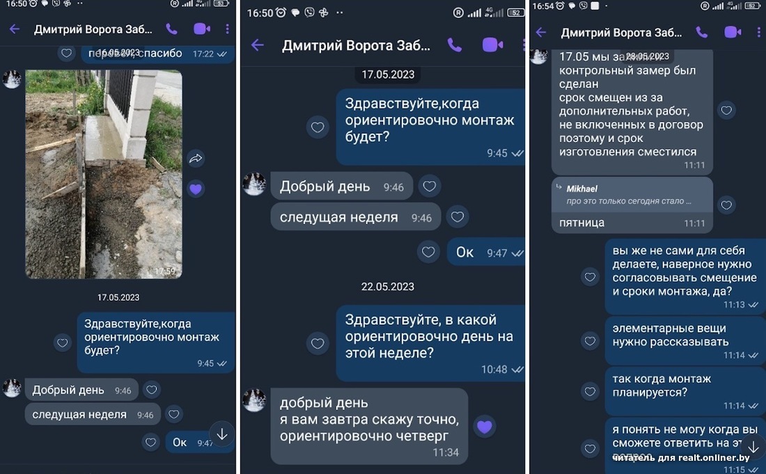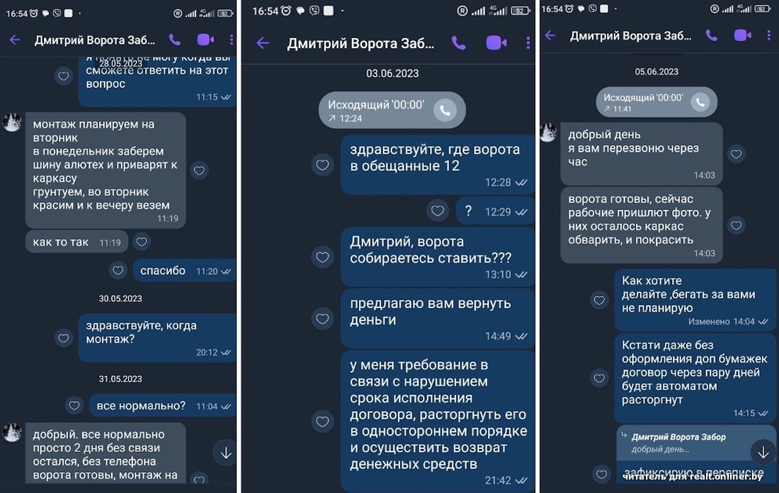 В похожую историю с этой же компанией попал и другой минчанин, Михаил. Ему нужно было изготовить и установить металлические откатные ворота и калитку. «Без заполнения, только каркас и без автоматики», — уточнял в своем объявлении мужчина.