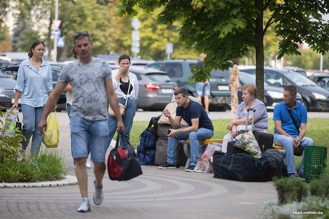 — Вон наша дочка стоит, красные волосы, — рассказывают Жанна и Виктор из Березы, что в Брестской области. — Ждем, заодно охраняем и чужие сумки — по-соседски.