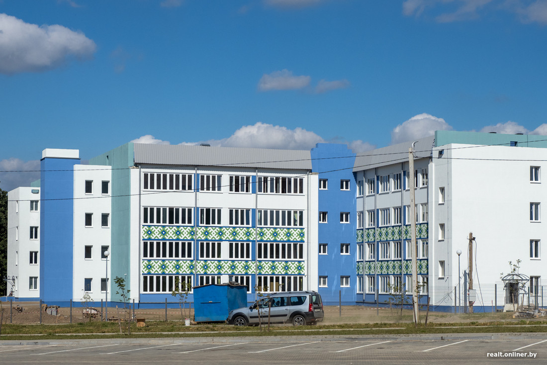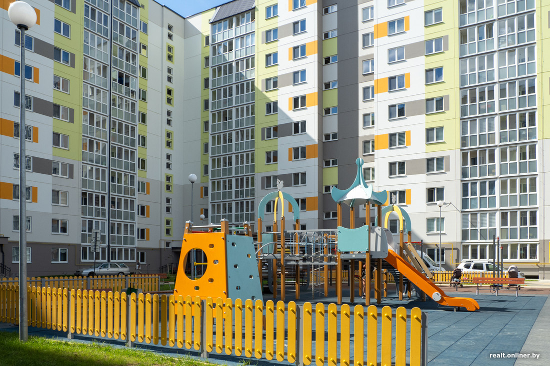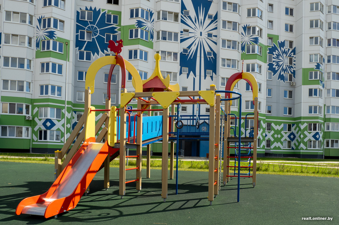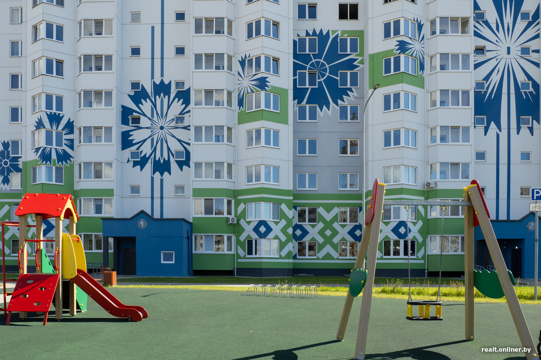 Эта новостройка еще моложе: сдавали весной, а сейчас там вовсю идут ремонты. Тут заказчиком был УКС Миноблисполкома, генподрядчиком — Солигорский домостроительный комбинат. «Квадрат» с отделкой обошелся очередникам примерно в 1400 рублей, без отделки — в 1260. Возле дома также современная детская площадка, а еще — крытая велопарковка.