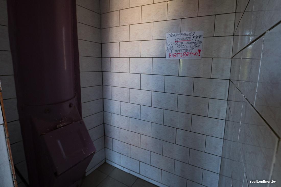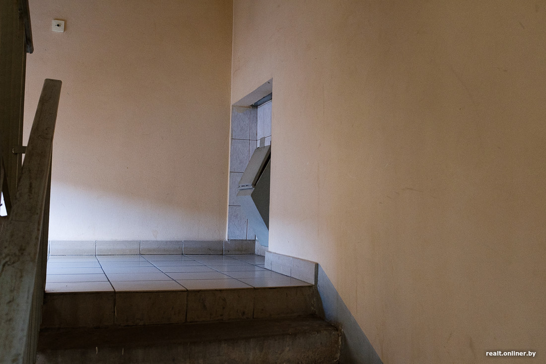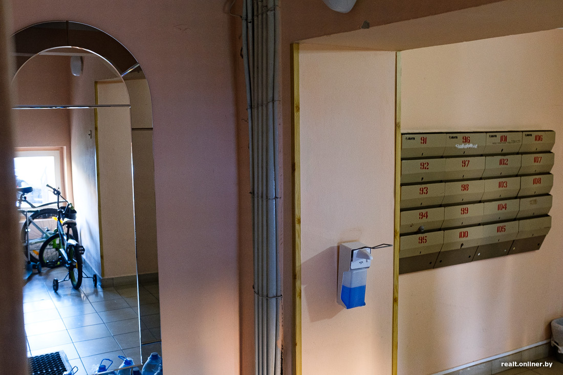 Несмотря на все эти моменты, входы в подъезды не особенно примечательные, внутри — сегодняшний классический минский подъезд.