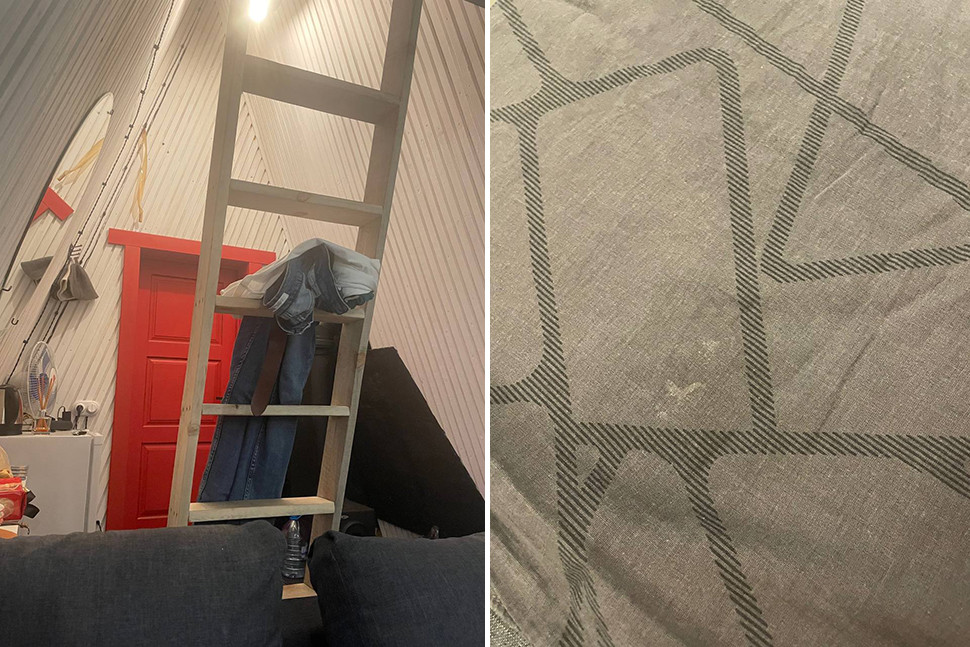 К слову, дом ну очень маленький. Места для хранения вещей нет, хотя в Instagram указано, что вмещает он в себя до четырех человек. Спать на втором этаже неудобно, ведь матрац там полуторный. К тому же это, на мой взгляд, небезопасно: угол наклона лестницы такой, что сложно представить, кто может без особых усилий оттуда спуститься. На двоих взрослых людей предоставляется полуторное постельное белье.