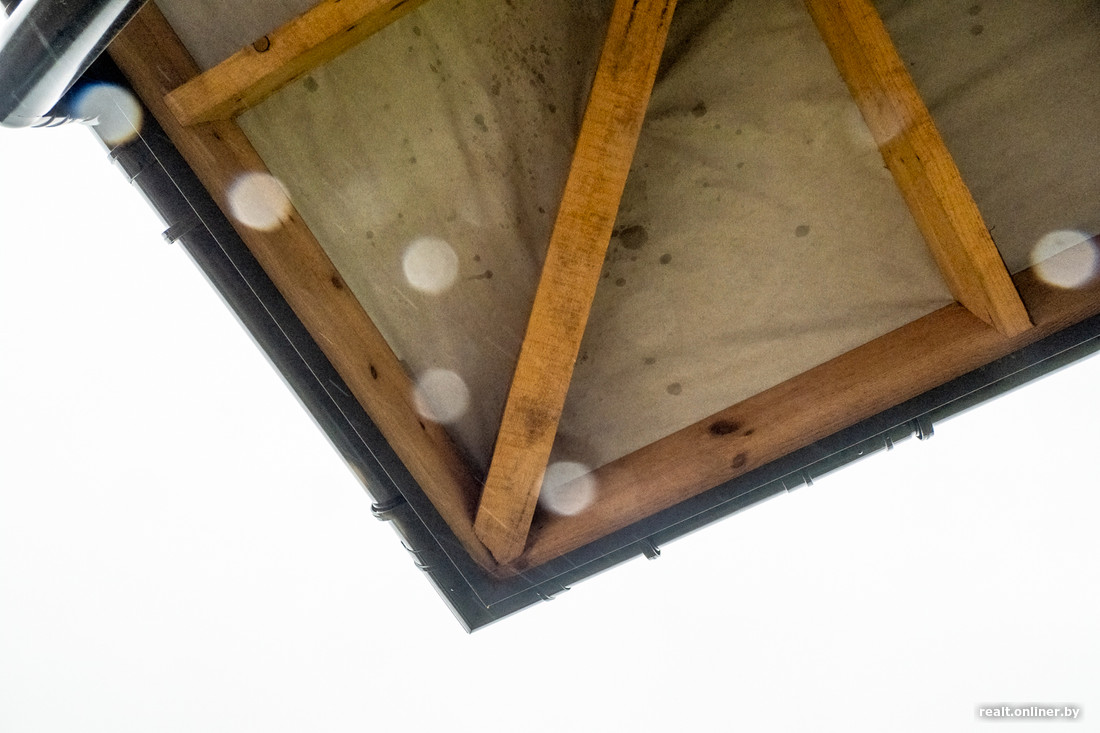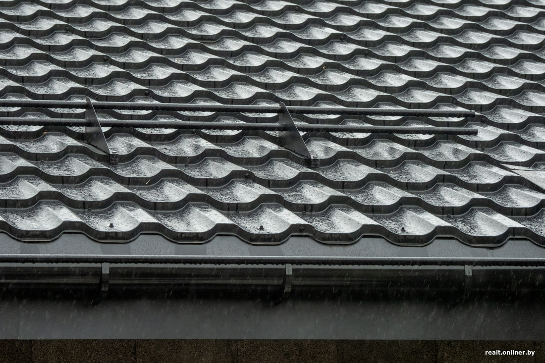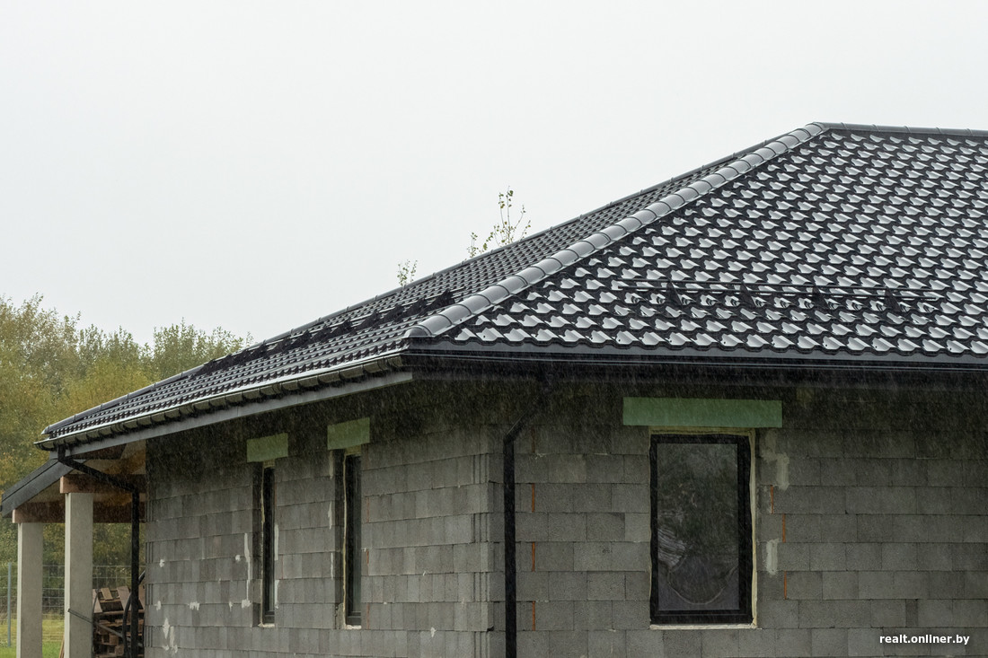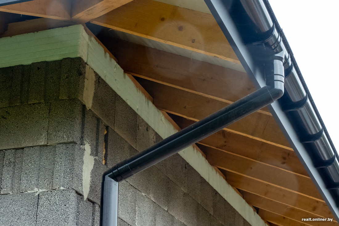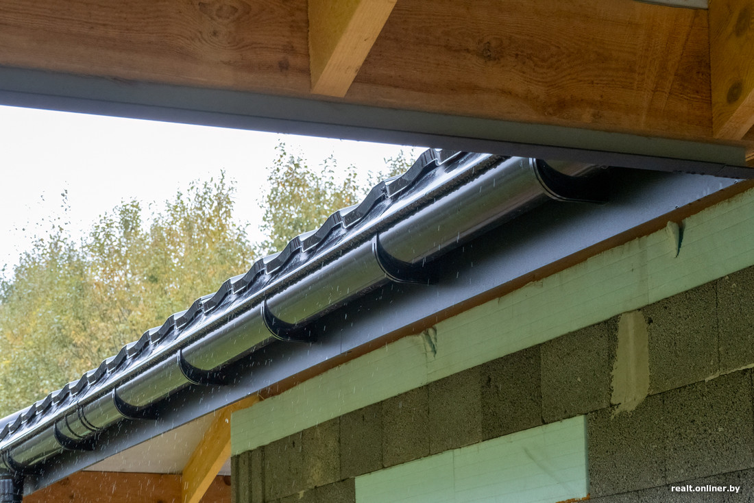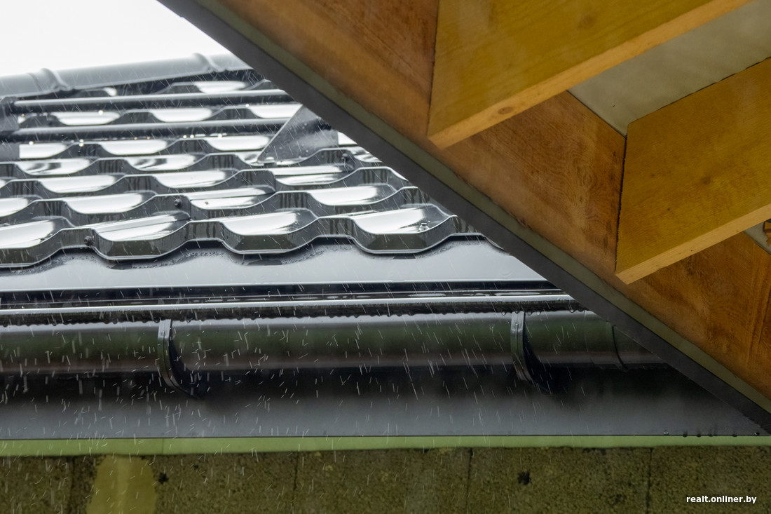 По уму организован и капельник: вода (а мы принимали дом как раз во время дождя) попадает точно в водосточную воронку. Кажется, все логично и так и должно быть. Но, увы, не все строители об этом помнят. Частая ошибка на объектах — когда капельник смонтирован под прямым углом и вода попадает мимо водосточного желоба.
