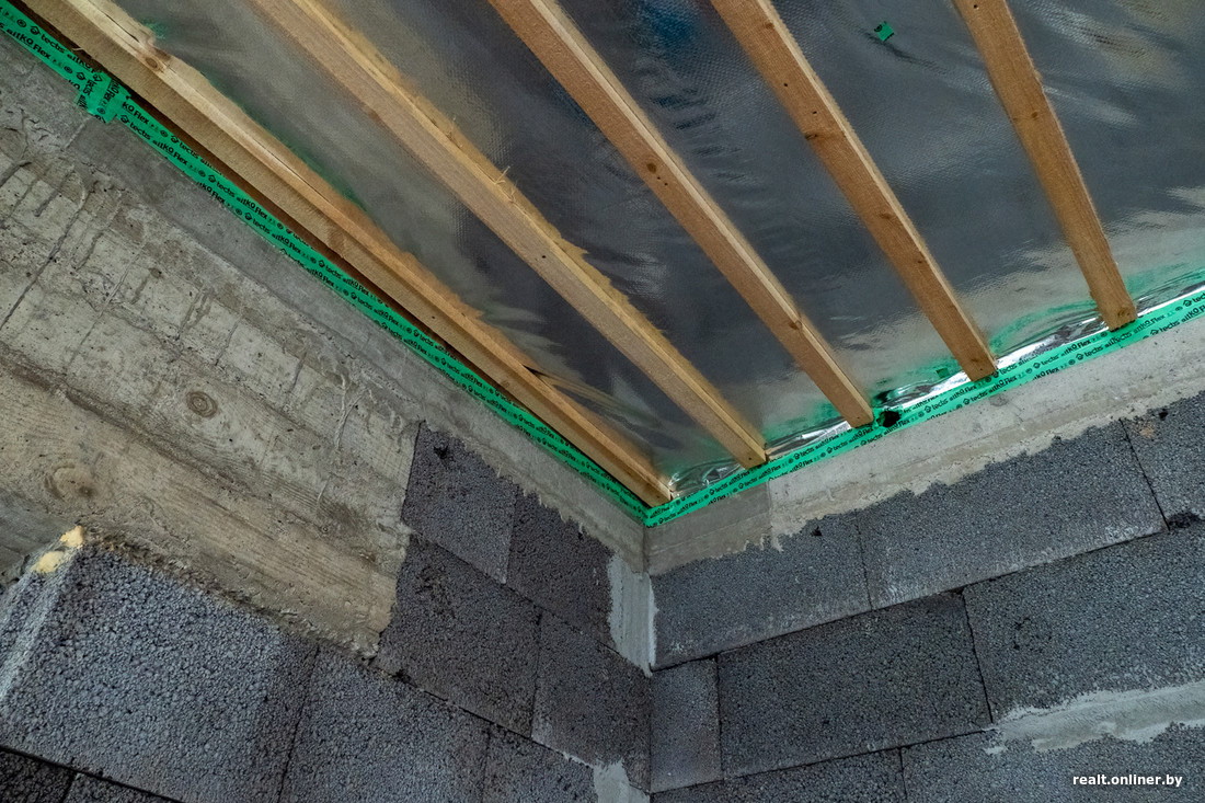 Что еще с ходу бросается в глаза в этом доме, так это правильно выполненная пароизоляция кровли. Лучше ничего и не придумаешь. Я не видел подобного исполнения на протяжении не знаю скольки лет: здесь действительно удалось добиться эффекта парника (в хорошем смысле этого слова). Вся влага, которая возникает в доме в процессе жизнедеятельности людей, будет отводиться на стены, а не проникать внутрь, увлажняя (и приводя постепенно в негодность) утеплитель. Не побоюсь громких слов: это идеальное исполнение.