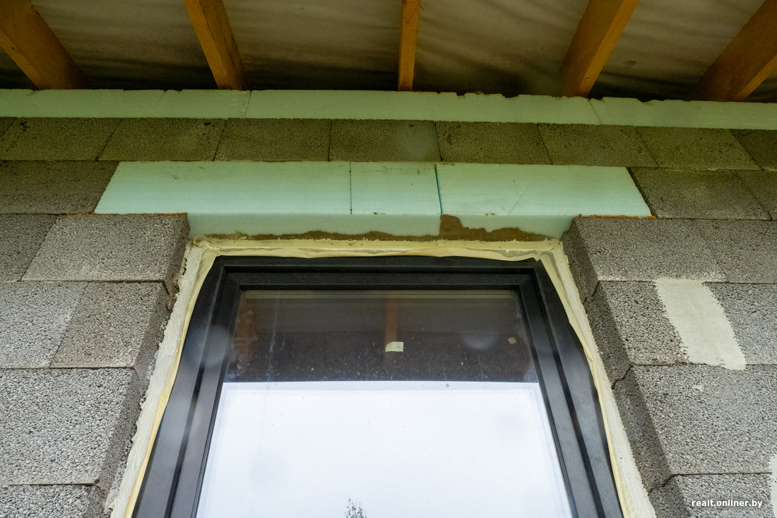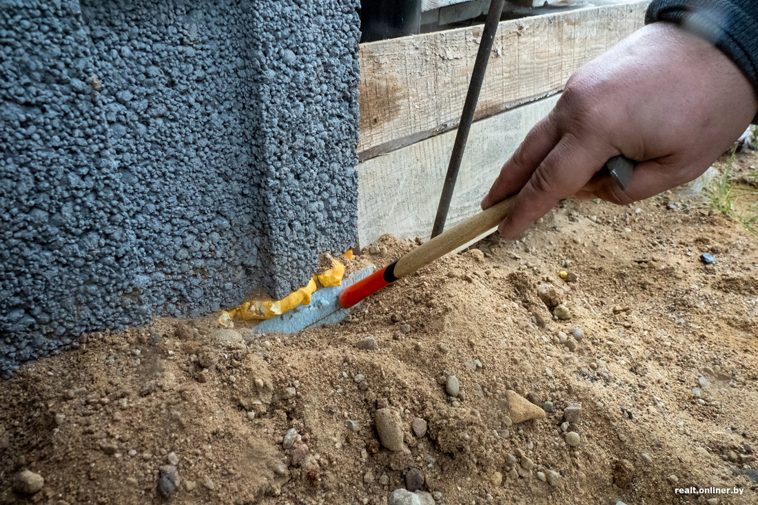 Этот теплоизоляционный материал категорически не любит ультрафиолет. Именно поэтому он присыпан землей и песком по всему периметру дома. «Такая „маскировка“ поможет сохранить материал от выгорания и разрушения вплоть до того момента, пока не будет выполнена наружная отделка дома. Простое и грамотное решение», — комментирует специалист.