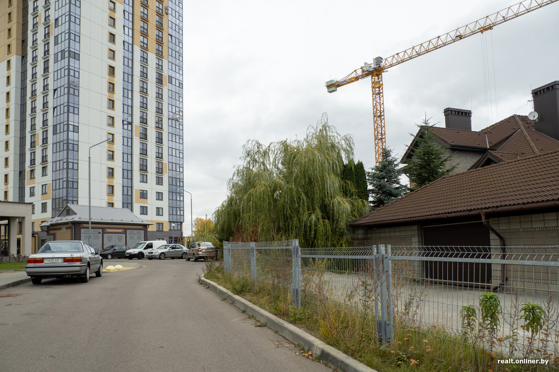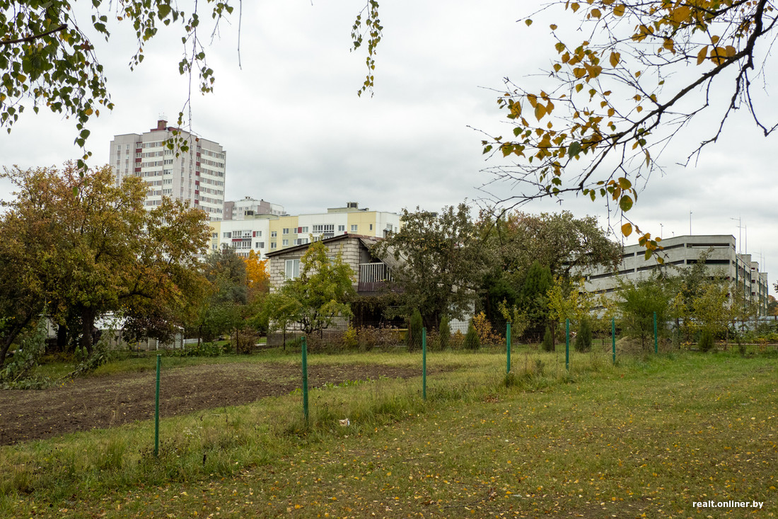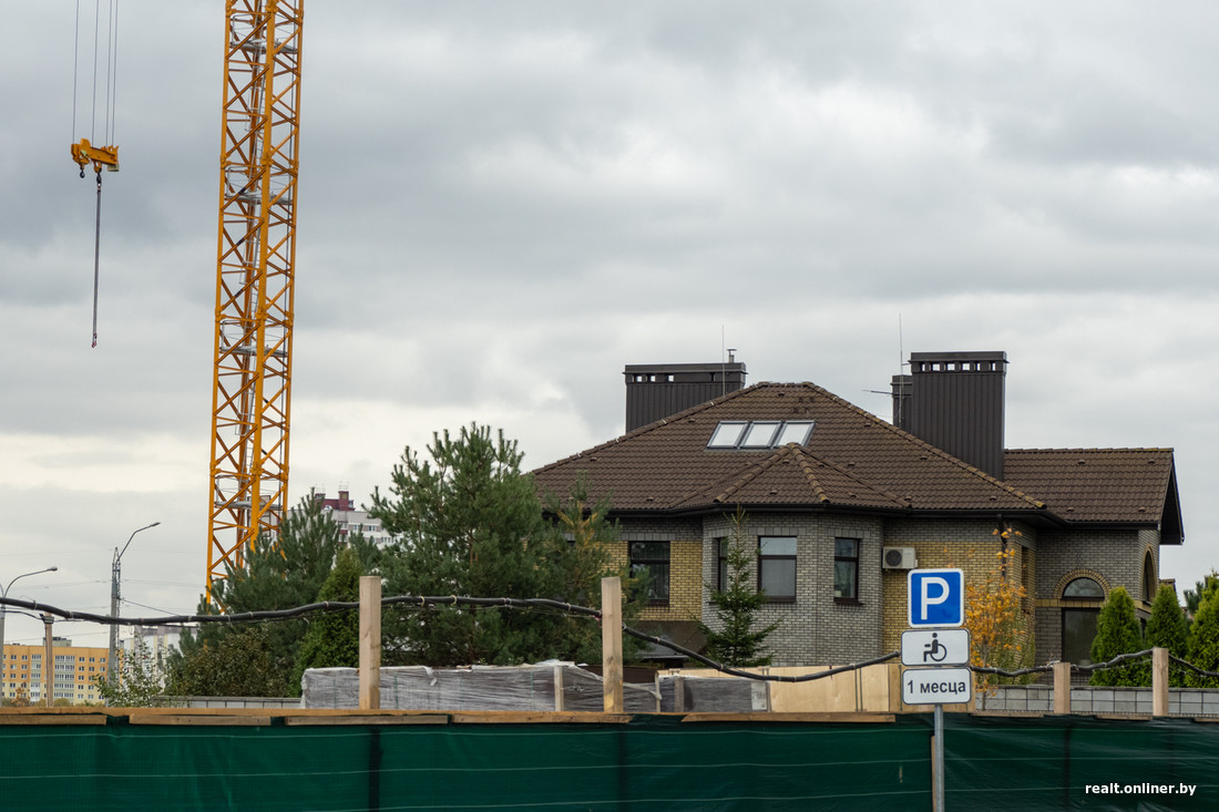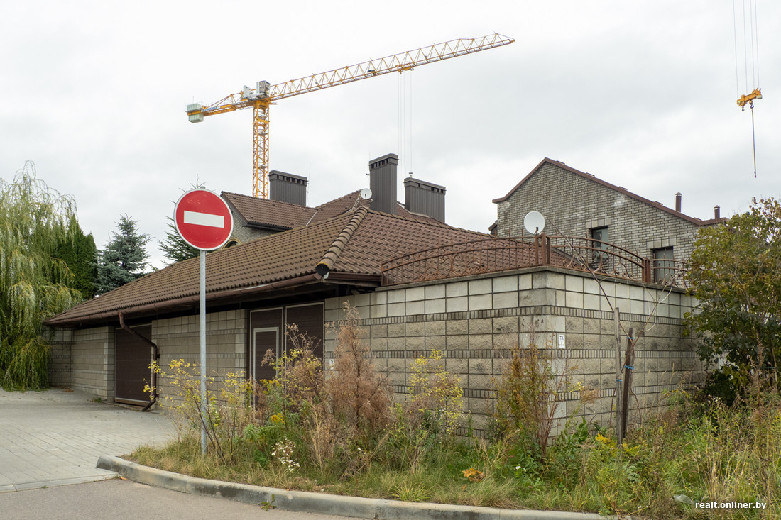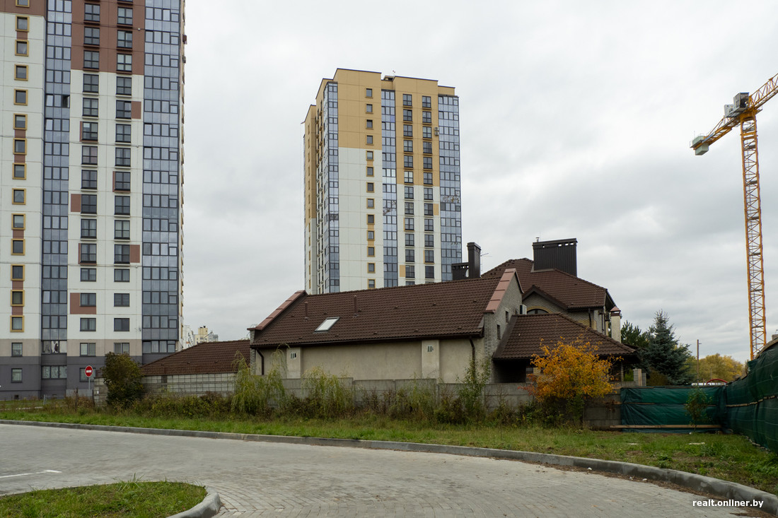 Самый примечательный — вот этот коттедж на пересечении улиц Янки Лучины и Виктора Турова. Он остался одиноким — на краю новых магистралей и прямо под окнами двух мапидовских «столбиков».