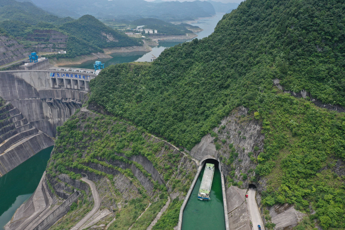 Для того чтобы корабль (максимальным водоизмещением в 500 тонн) мог подняться из реки У в водохранилище станции, он использует сначала первый вертикальный судовой лифт (с высотой подъема 72 метра), затем идет по бетонному акведуку ко второму судоподъемнику (с высотой подъема 127 метров), потом движется по второму акведуку, преодолевает скалу, на которую опирается плотина, по первому в Китае корабельному тоннелю и, наконец, с помощью третьего вертикального лифта (с высотой подъема 47 метров) опускается в водохранилище. Использование сразу трех судоподъемников, а также расширения на акведуках позволило существенно увеличить пропускную способность системы и избежать образования пробок из судов.