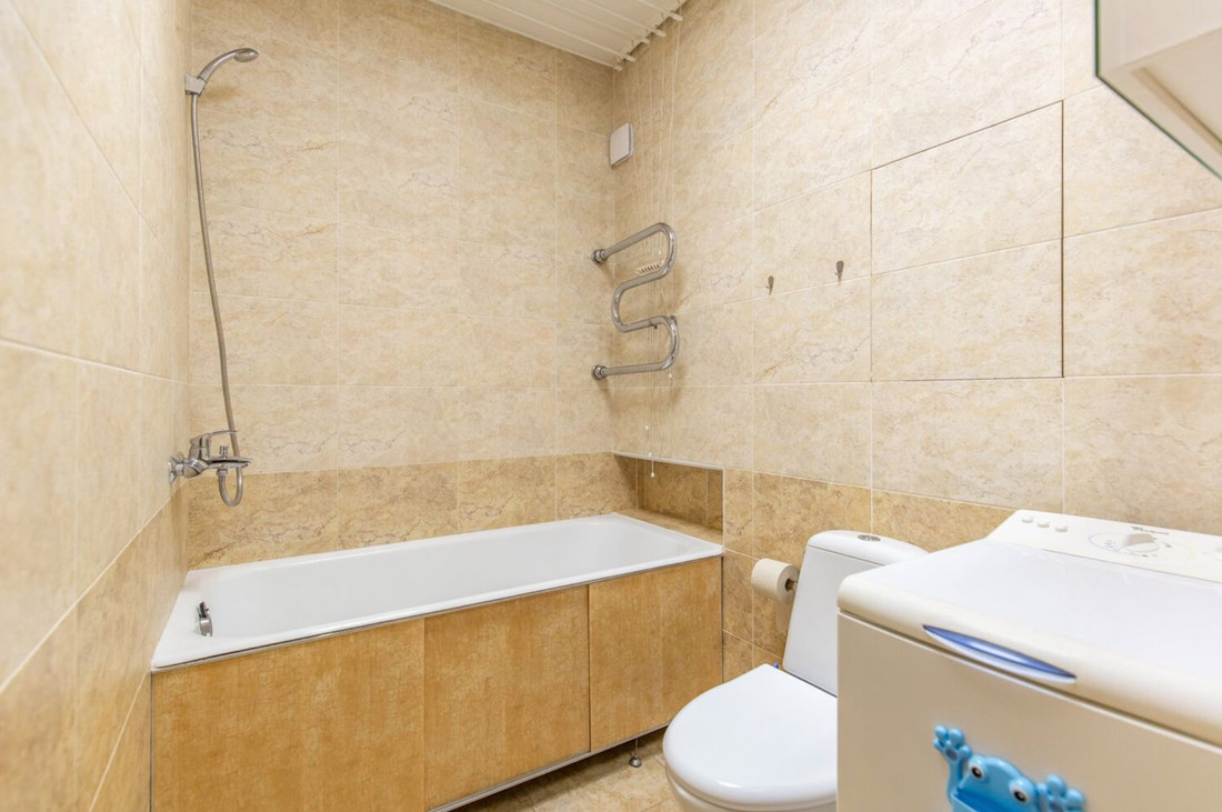Столько же стоит микроквартира на 22 «квадрата» в здании 1972 года. Размер жилой комнаты — 11, 4 кв. м, кухни — всего 4,5. В ней даже не поместился небольшой холодильник — ему нашлось место в гостиной, которая одновременно и спальня, и кабинет. Для холостяка или холостячки — вполне себе вариант. Тем более что обстановка тут вполне себе приятная — видно, что ремонт сделан совсем не в прошлом веке.