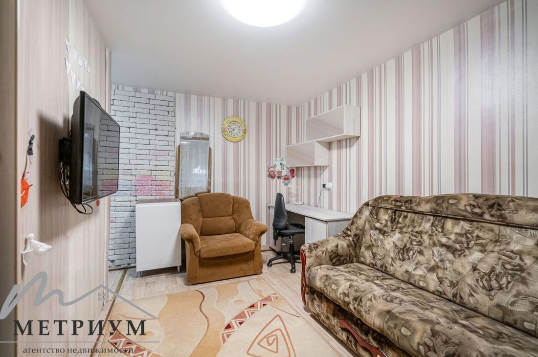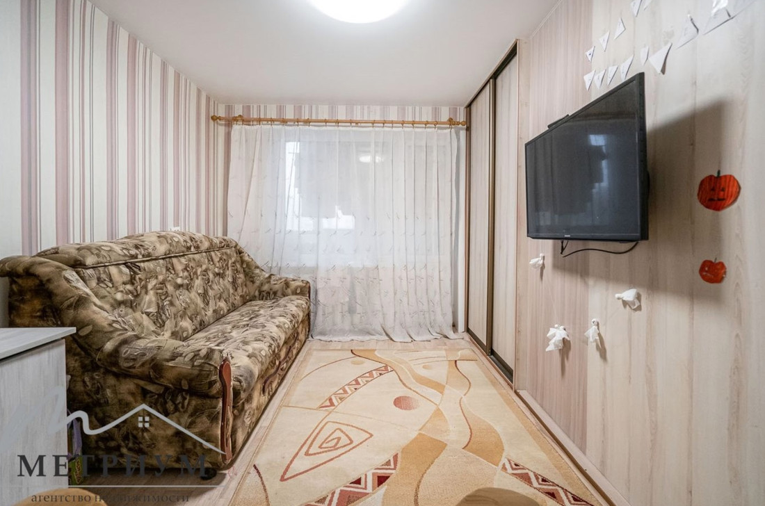 Второй вариант находится на улице Матусевича, в 5 минутах от станции метро «Пушкинская». Пожалуй, эта квартира выглядит самой современной из всех, что представлены в подборке. Натяжные потолки, ламинат на полу, свежие обои на стенах, приличного вида мебель (частично она останется новым владельцам).