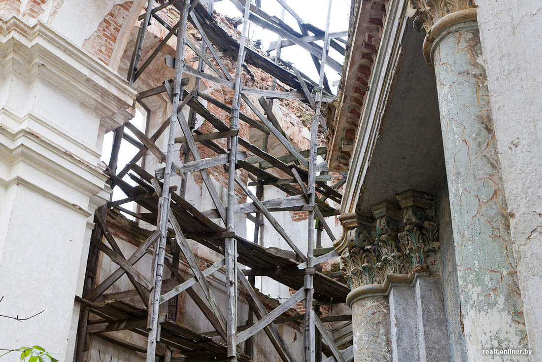 Перед тем как приступить к консервации, костел нужно было почистить — освободить строение от свисающих прогнивших балок и огромных деревьев, проросших по всему зданию. Высота стен в 18 с лишним метров требовала крана или другой дорогостоящей техники. Чтобы сократить расходы, нашли элегантное решение. Юрий Гуль, альпинист со стажем, собрал своих ребят, и молодая команда начала расчистку. Висячие балки оказались достаточно крепкими: цельные, 9 метров длиной, они когда-то привозились сюда прямо из Беловежской пущи.