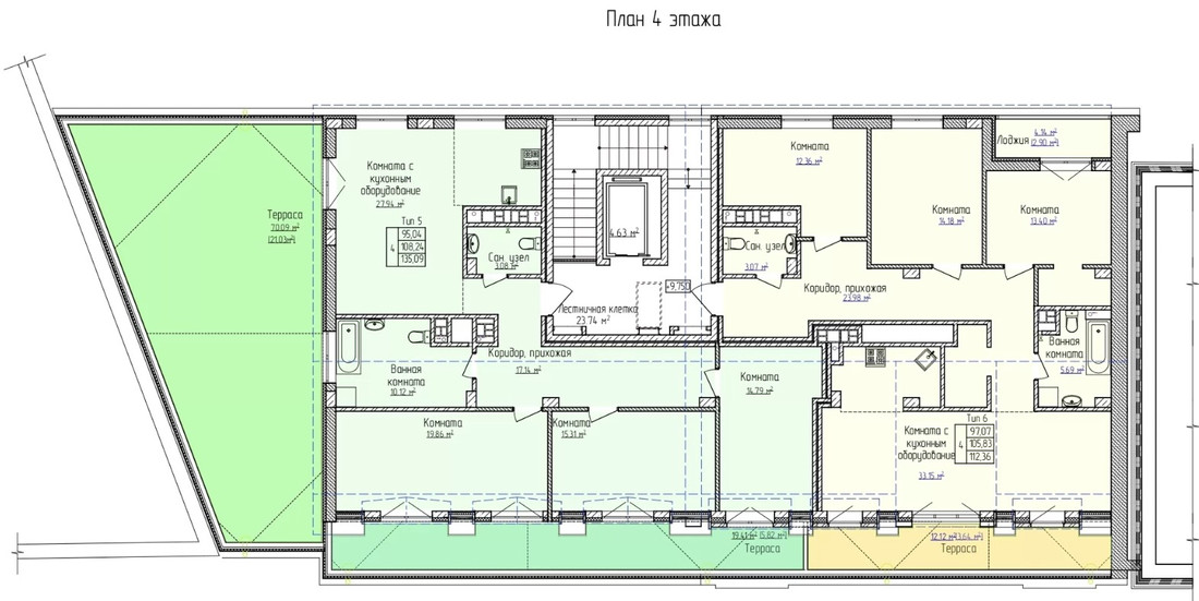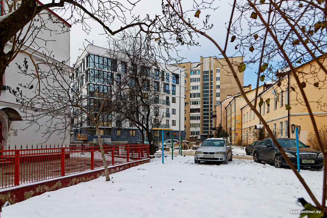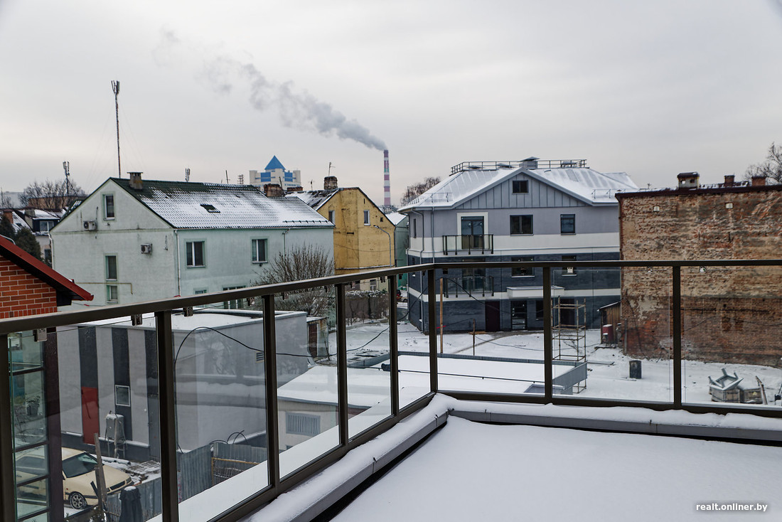 «Домики» на верхнем этаже — пространство со свободной планировкой, разделенное на две 4-комнатные квартиры. В одной из них предусмотрены две террасы общей площадью 70 квадратных метров с выходом из кухни-гостиной и спальни. Общая площадь террас — с 3-комнатную квартиру в стандартной панельке! Во второй квартире — одна терраса на 12 «квадратов» с выходом из кухни-гостиной. С террас открывается вид на тенистую улицу Гоголя с брестской достопримечательностью — аллеей фонарей. Жилое пространство светлое — за счет больших окон в пол и высоких 3-метровых потолков. Окно с видом на террасу есть даже в небольшом помещении, где можно оборудовать ванную или гардеробную. Еще один бонус — лифт в 4-этажном доме, стартующий с нулевого уровня.