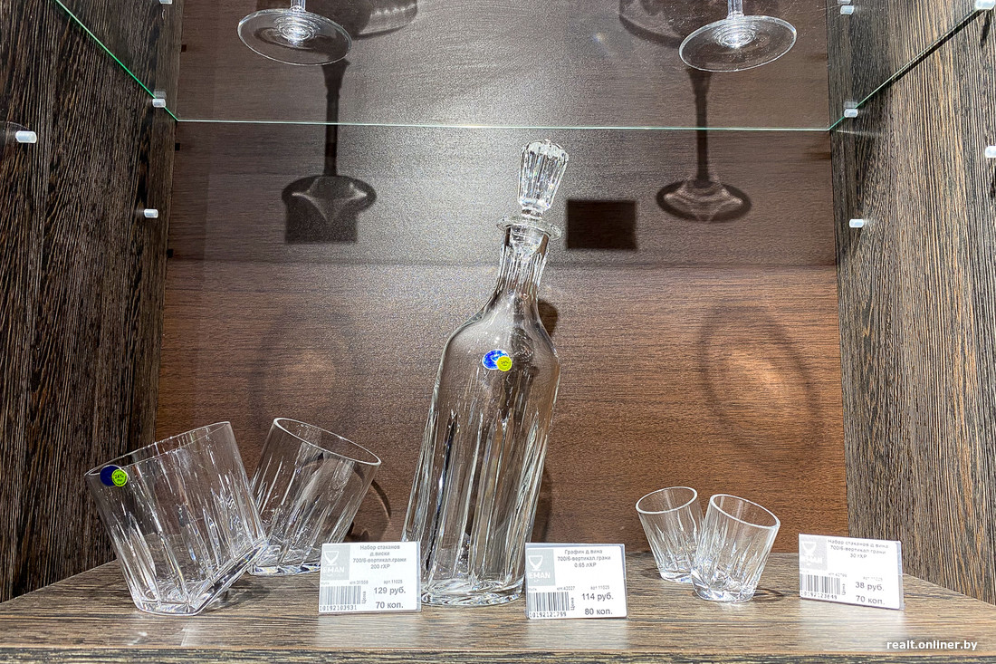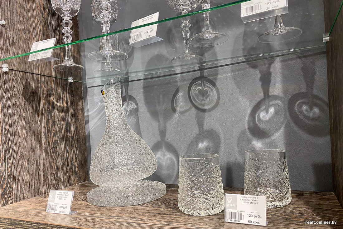 Посуду мы нашли в двух местах. В магазине стеклозавода «Неман» хватает элегантных позиций: рюмки с узором из змеиной кожи, бокалы модных расцветок, «заваленные» на бок стаканы (все благодаря особой форме дна). Такими можно украсить шкафы с прозрачными витринами, которые часто встречаются в современных кухнях-гостиных.