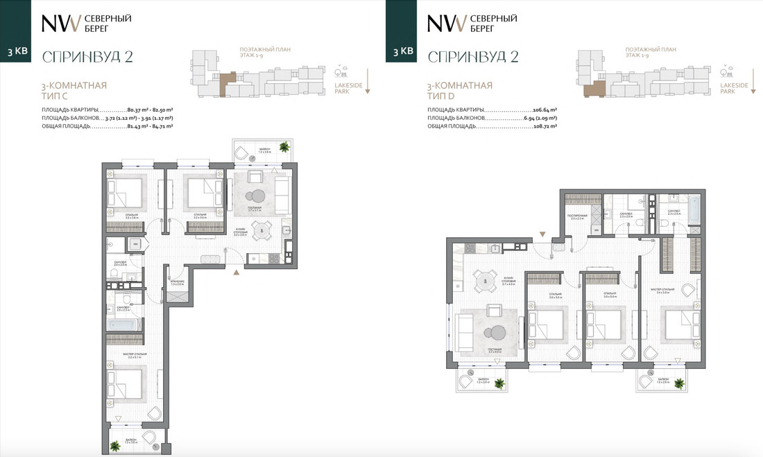 Для тех, кто любит большие пространства, предусмотрены трешки нескольких типов (распашонки и на одну сторону). В этих вариантах по два просторных санузла. Спальни имеют площади от 10 до 17 квадратных метров, проектом заложены гардеробные. Всего же метраж таких квартир достигает 80—107 «квадратов».