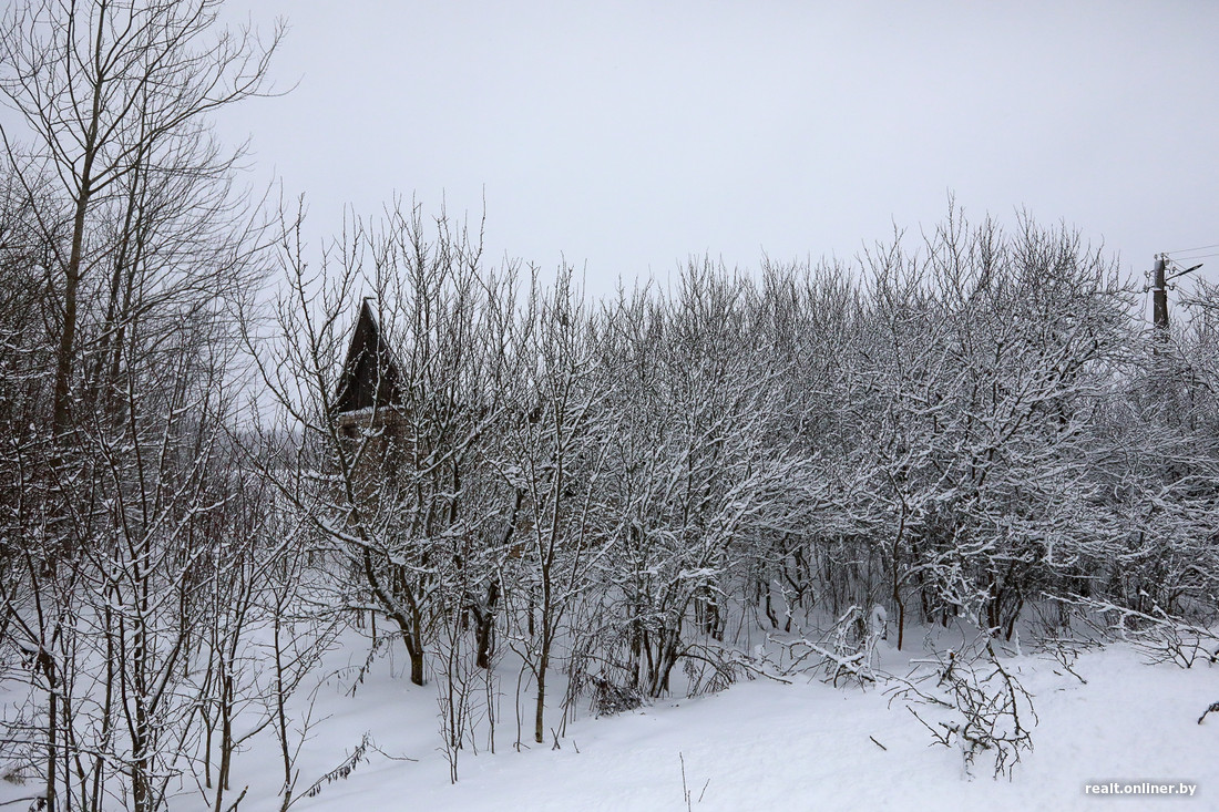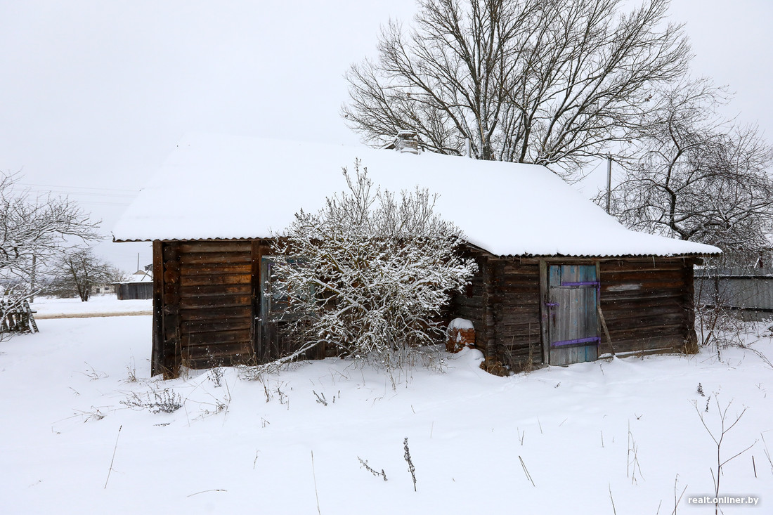 Место уютное и живописное: раскидистые деревья по бокам дороги, сады на задних дворах. Вид впечатляет даже зимой, а уж как тут красиво должно быть летом! Едем по улице Центральной, прямо до дома под номером 24а. Почти черный сруб на белоснежной «подкладке» из снега и есть та самая хата на продажу.