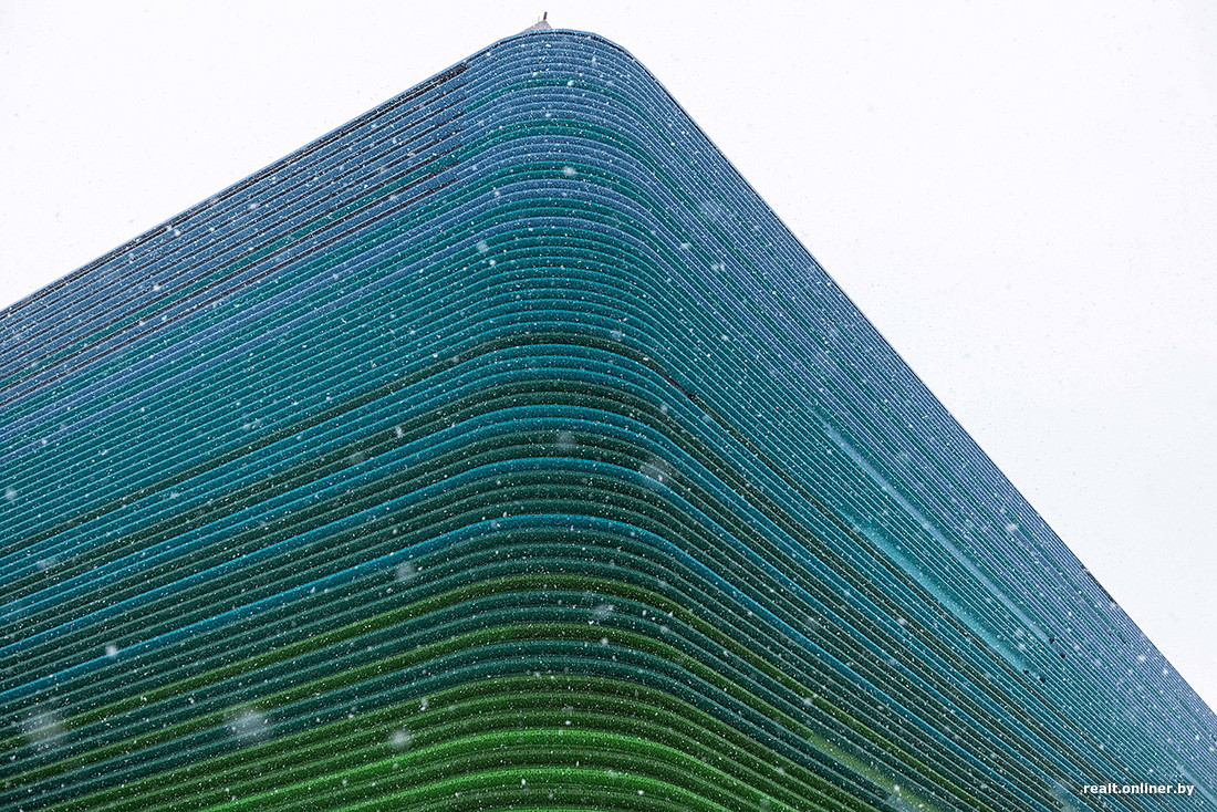 За узнаваемость молла отвечает яркий фасад сложного цвета, где угадываются оттенки зеленого, желтого, серого. Чтобы создать эффект художественной палитры, понадобилось около 20 000 ламелей перфорированного алюминия.