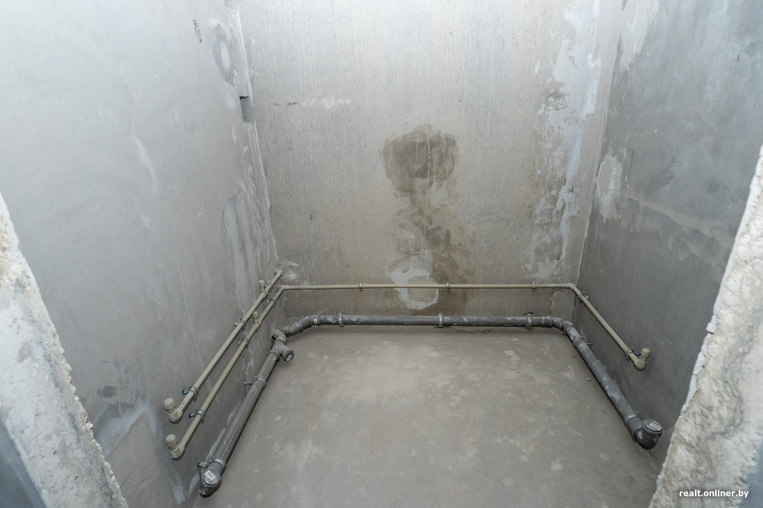 Заходим в ванную комнату и обнаруживаем, что гидроизоляция в помещении не выполнена (не было по проекту). Максим Морозов советует все же озаботиться этим моментом, чтобы потом не иметь проблем с соседями. Решить задачку можно самостоятельно: достаточно купить в магазине состав (он относительно недорогой) и промазать им пол и стены на небольшую высоту. От греха подальше, как говорится.