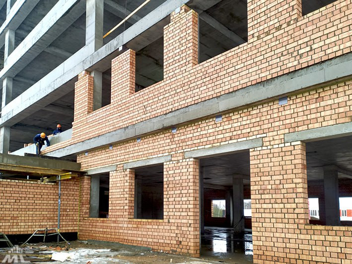 С весны прошлого года рядом с БГМУ идет большая стройка. Восемь этажей, полукруглая пристройка, вместительная парковка — и нет, это не жилой дом или общежитие, а новый корпус медуниверситета. За неполный год здание уже вытянулось в полный рост, сейчас рабочие приступили к каменной кладке. Обратите внимание, что для заполнения стен был выбран классический красный кирпич и поризованный керамический блок, что большая редкость для наших краев и времени. Подробности рассказывает «Минскстрой».
