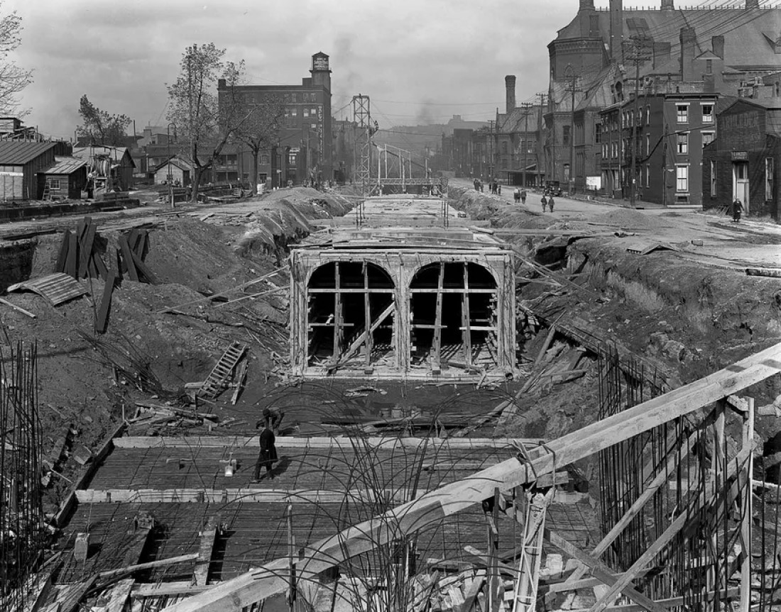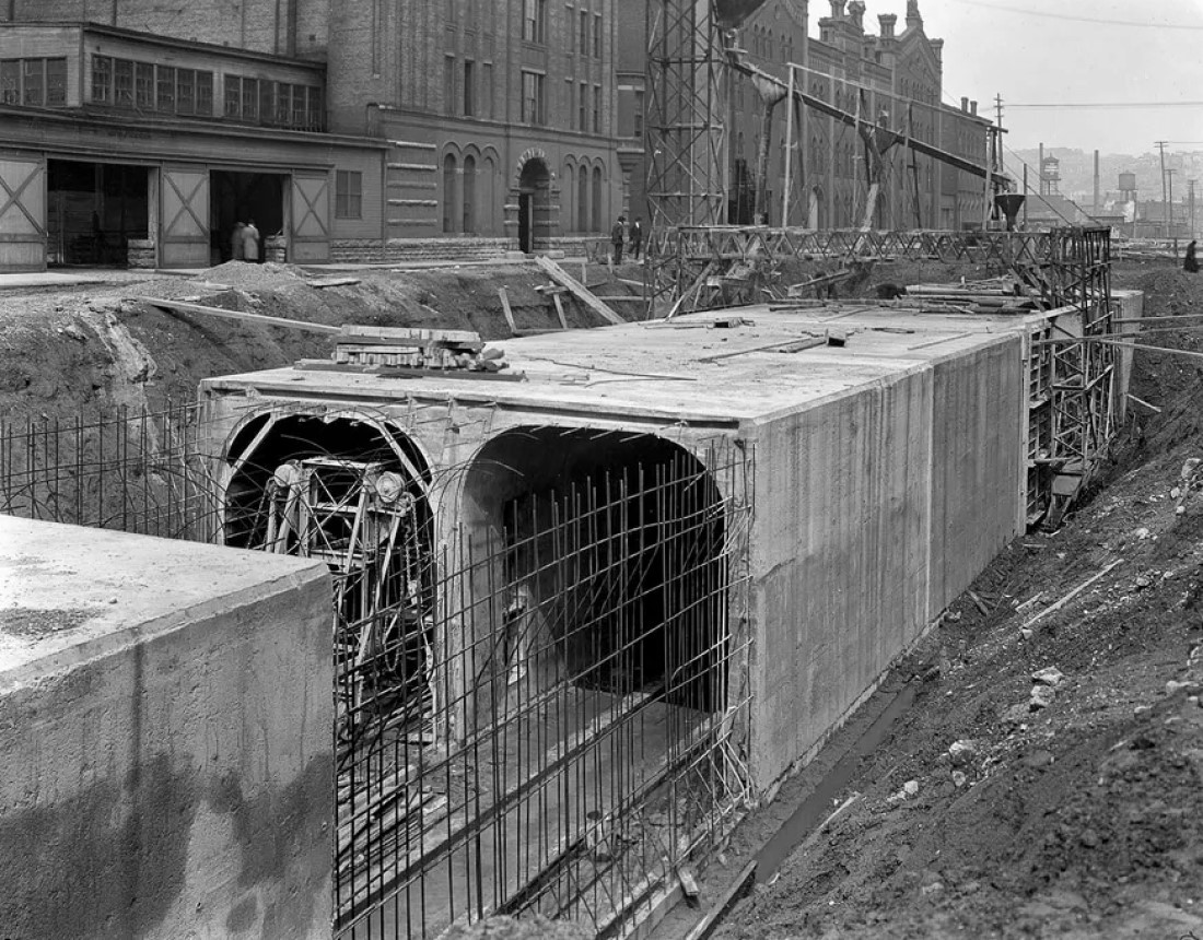 Строго говоря, подземка не предполагалась полностью подземной. Кольцо должно было частично пройти по земле и над ней по эстакадам наподобие чикагских. Но предполагался и подземный участок, который как раз и начали строить первым. В центре Цинциннати существовал канал, прежде наполненный водами реки Огайо, но к моменту начала стройки уже осушенный. Как раз по нему и должен был идти подземный фрагмент метросистемы. Это было удобно, потому что канал позволял вести фактически наземное строительство без использования проходческих щитов.