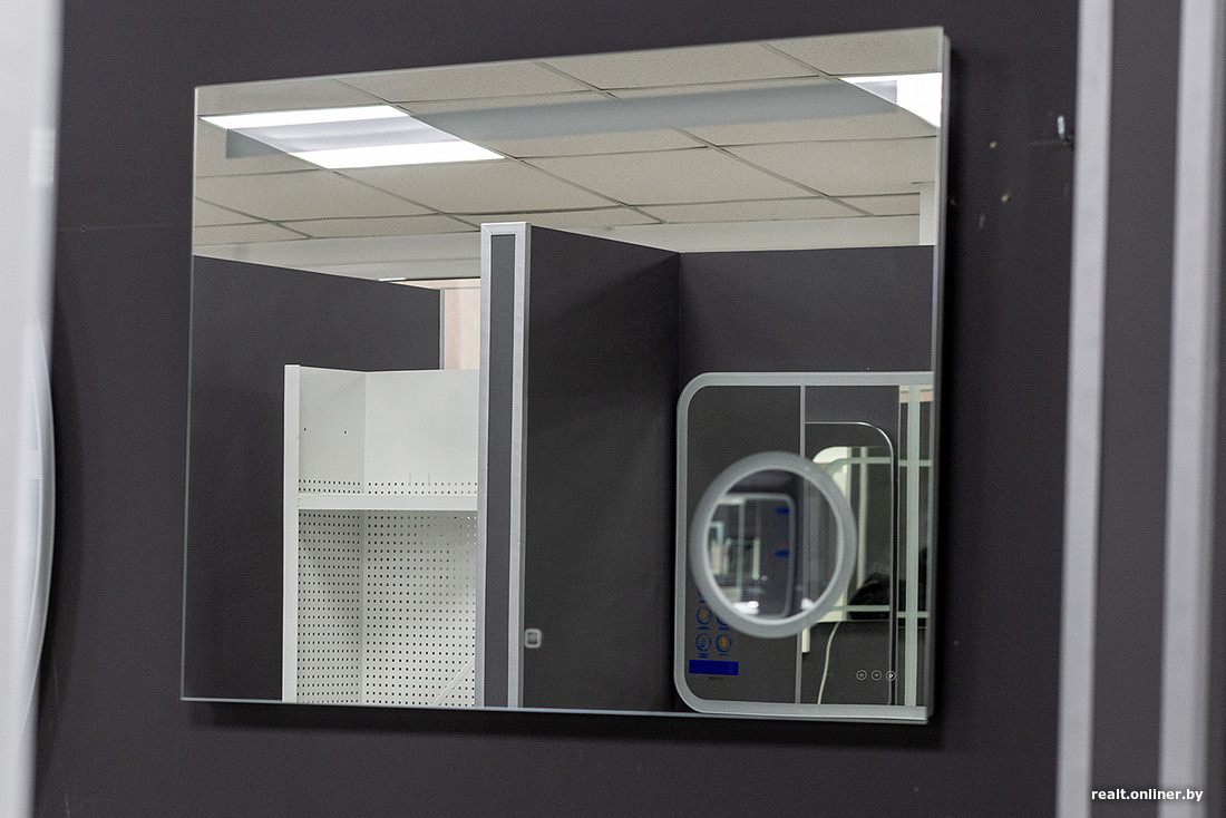 Нужный нам комплект из подвесного унитаза, инсталляции для него и кнопки мы нашли 654 рубля. А за 378 рублей — умывальник со столешницей в виде крыла, куда можно поставить стиральную машину. Зеркало с сенсорной подсветкой продается в магазине за 265 рублей, смеситель в ванну — за 194 рубля.