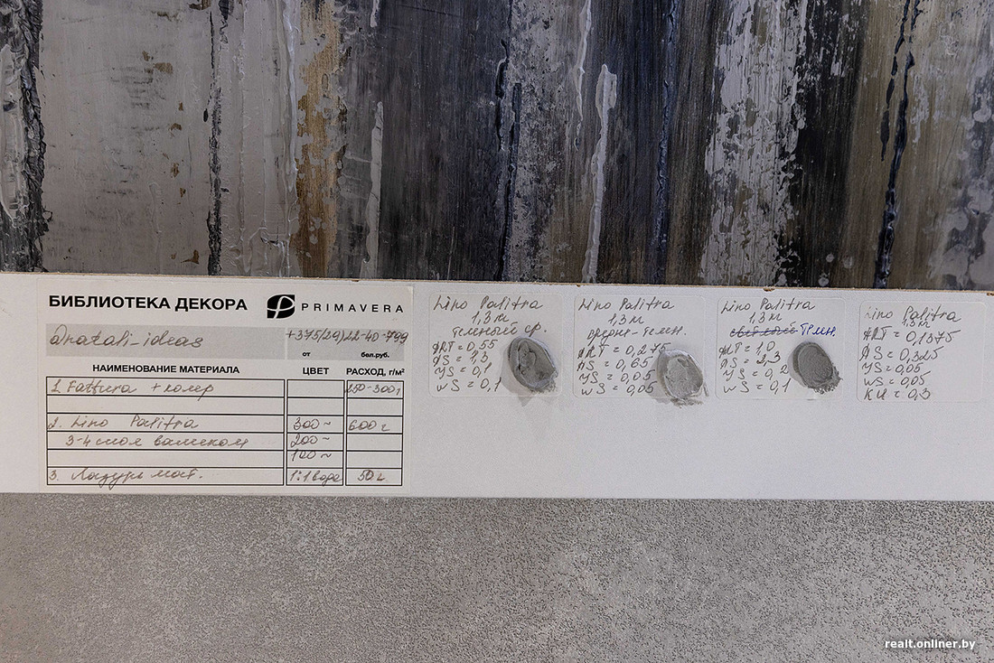Для этого проекта дизайнер подобрала штукатурку приятного серого оттенка от белорусского бренда Primavera. Стоимость материала на квадратный метр — 20 рублей. В пересчете на нашу квартиру получается 756 рублей.