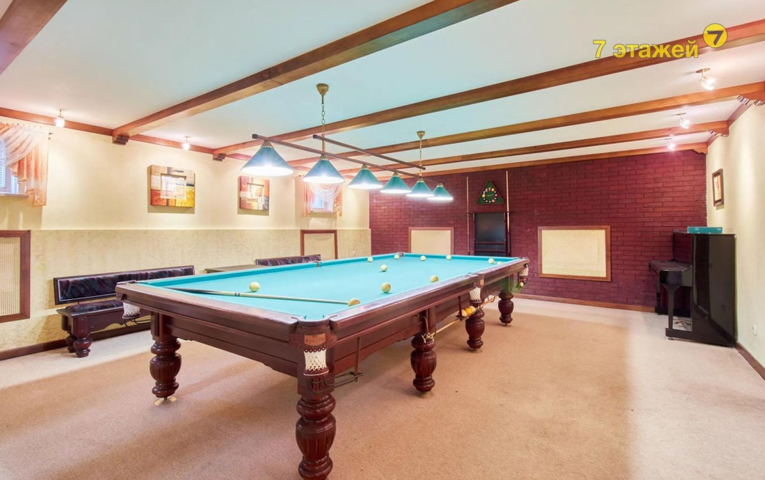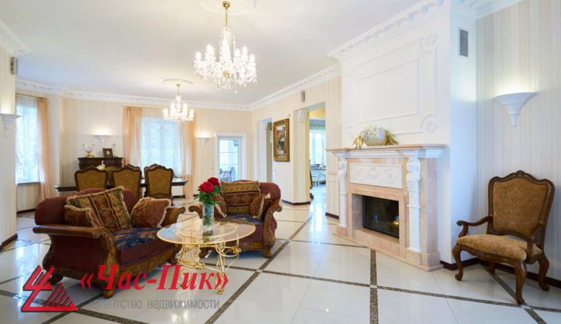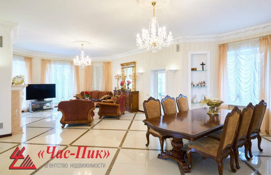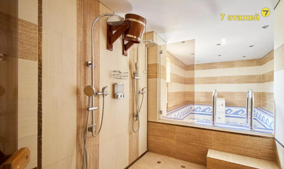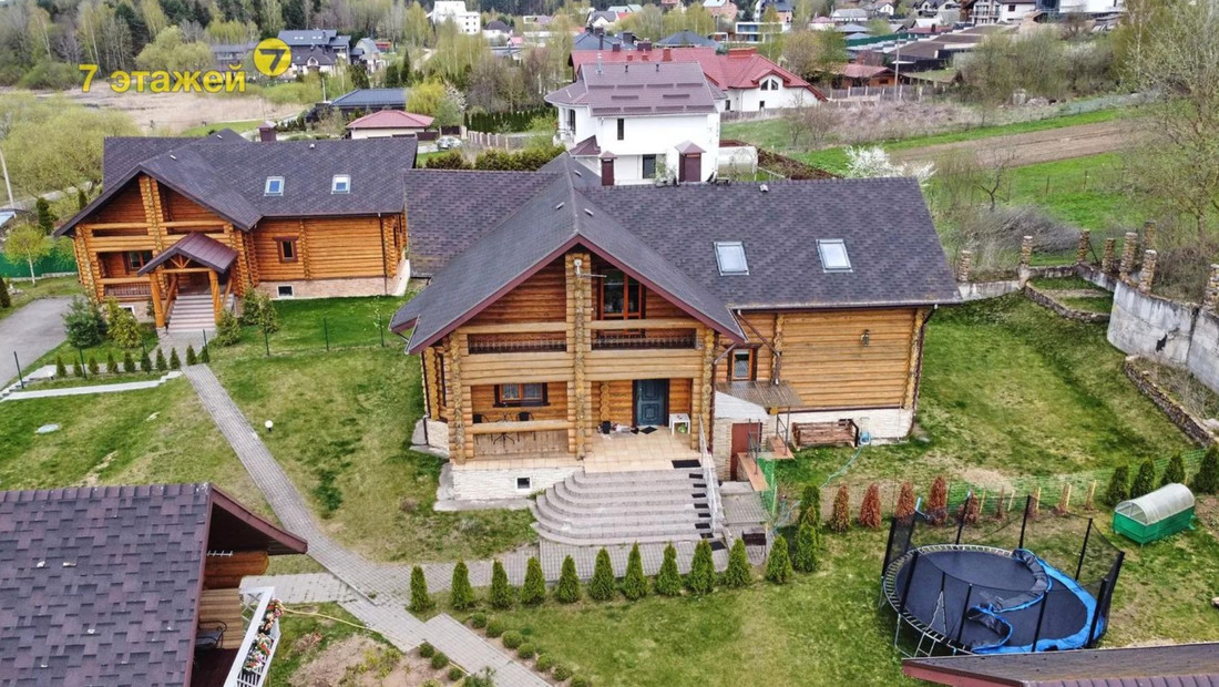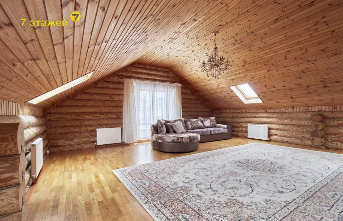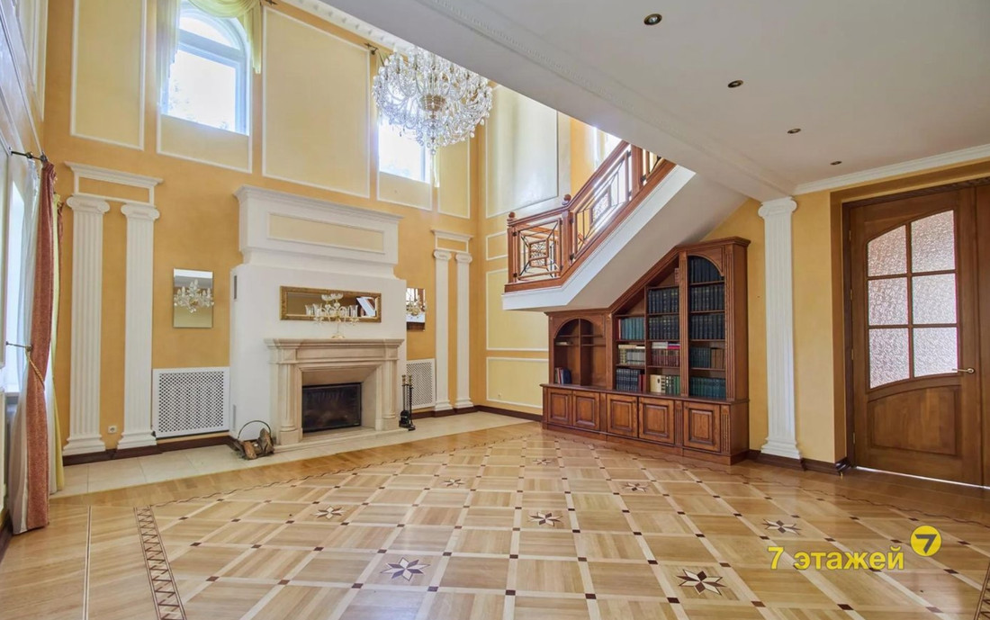 «На цокольном этаже размещается баня на дровах с купелью, русский бильярд, спортивная зона и холодная кладовая. На первом этаже расположены кабинет, кухня со столовой, просторная гостиная со вторым светом, которую украшает величественная люстра из богемского хрусталя, мраморный камин и библиотека. На втором — три спальни. Мансарду занимает гостиная с детской зоной, две спальни и гардероб. Также в доме пять санузлов», — пишут собственники.