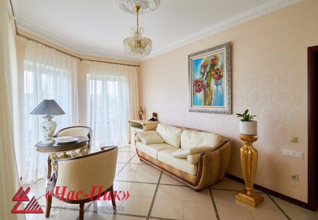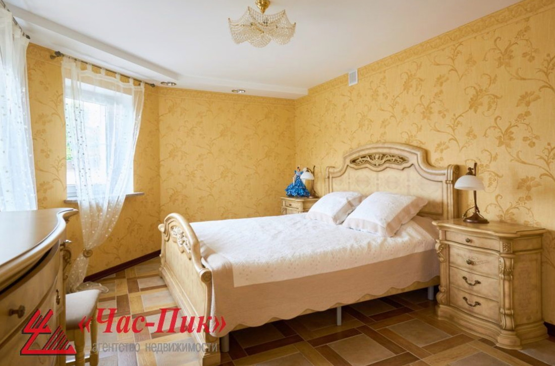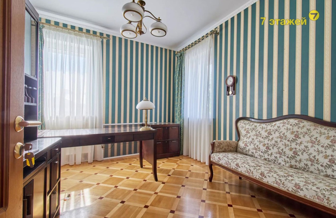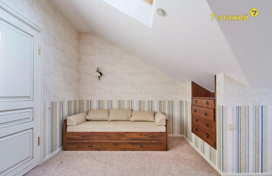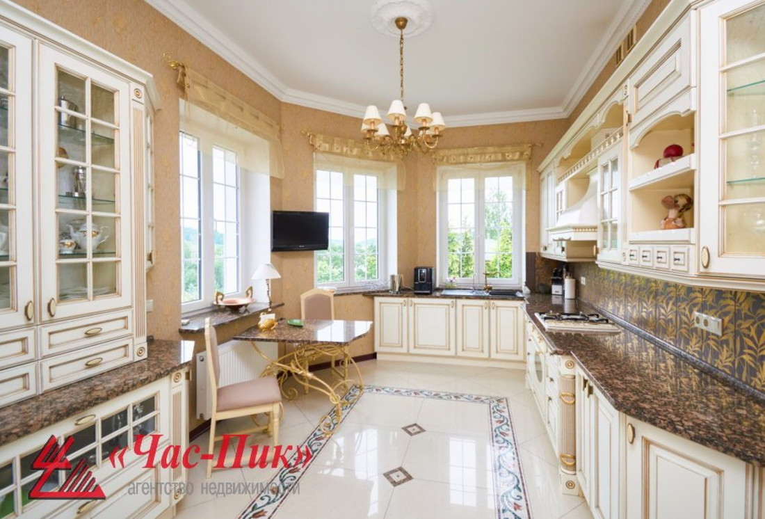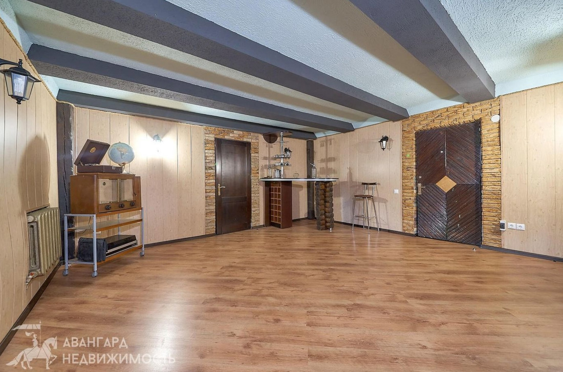 «На цокольном этаже размещается баня на дровах с купелью, русский бильярд, спортивная зона и холодная кладовая. На первом этаже расположены кабинет, кухня со столовой, просторная гостиная со вторым светом, которую украшает величественная люстра из богемского хрусталя, мраморный камин и библиотека. На втором — три спальни. Мансарду занимает гостиная с детской зоной, две спальни и гардероб. Также в доме пять санузлов», — пишут собственники.