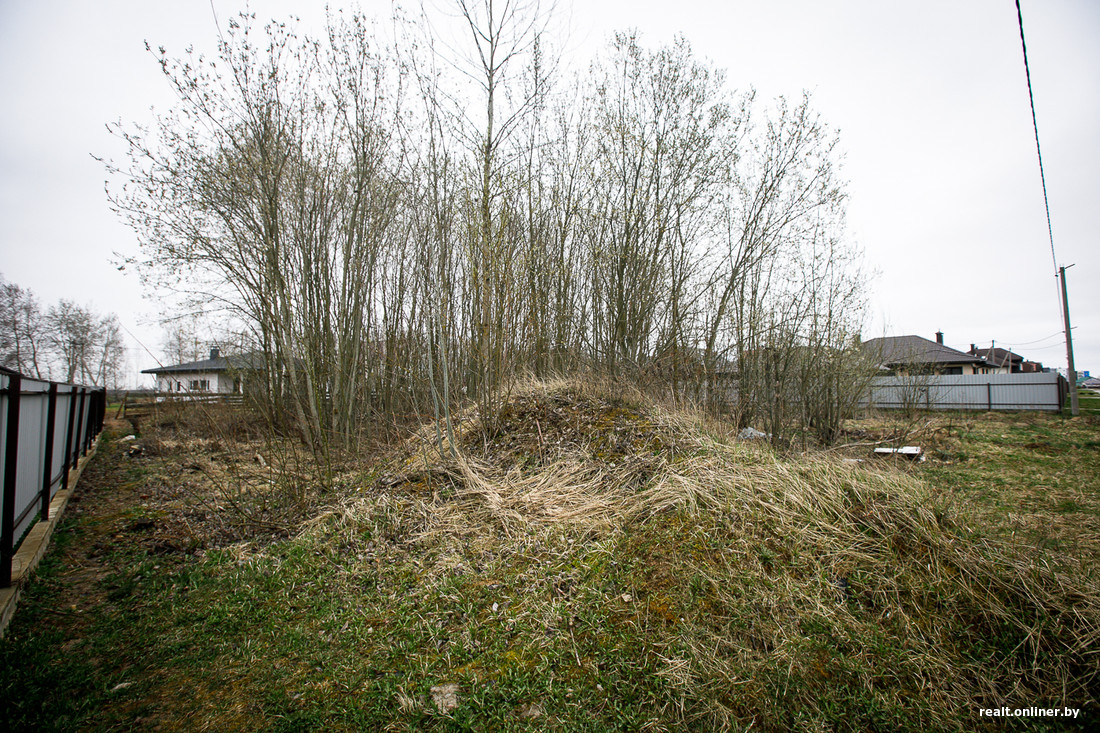 В Мачулищах нас ждут почти 12 соток. Похоже, за этот надел когда-то пытались взяться, но что-то не сложилось. С тех пор на участке выросли высокие деревья (и остались непонятные холмы). С обеих сторон от делянки — добротные коттеджи на огороженных участках. Будет стимул строиться побыстрее, чтобы стать с «отличниками» в ряд.
