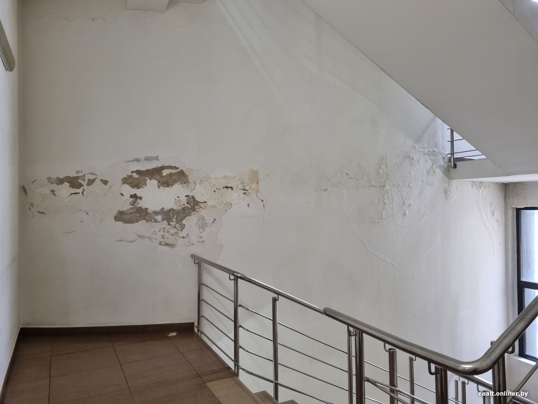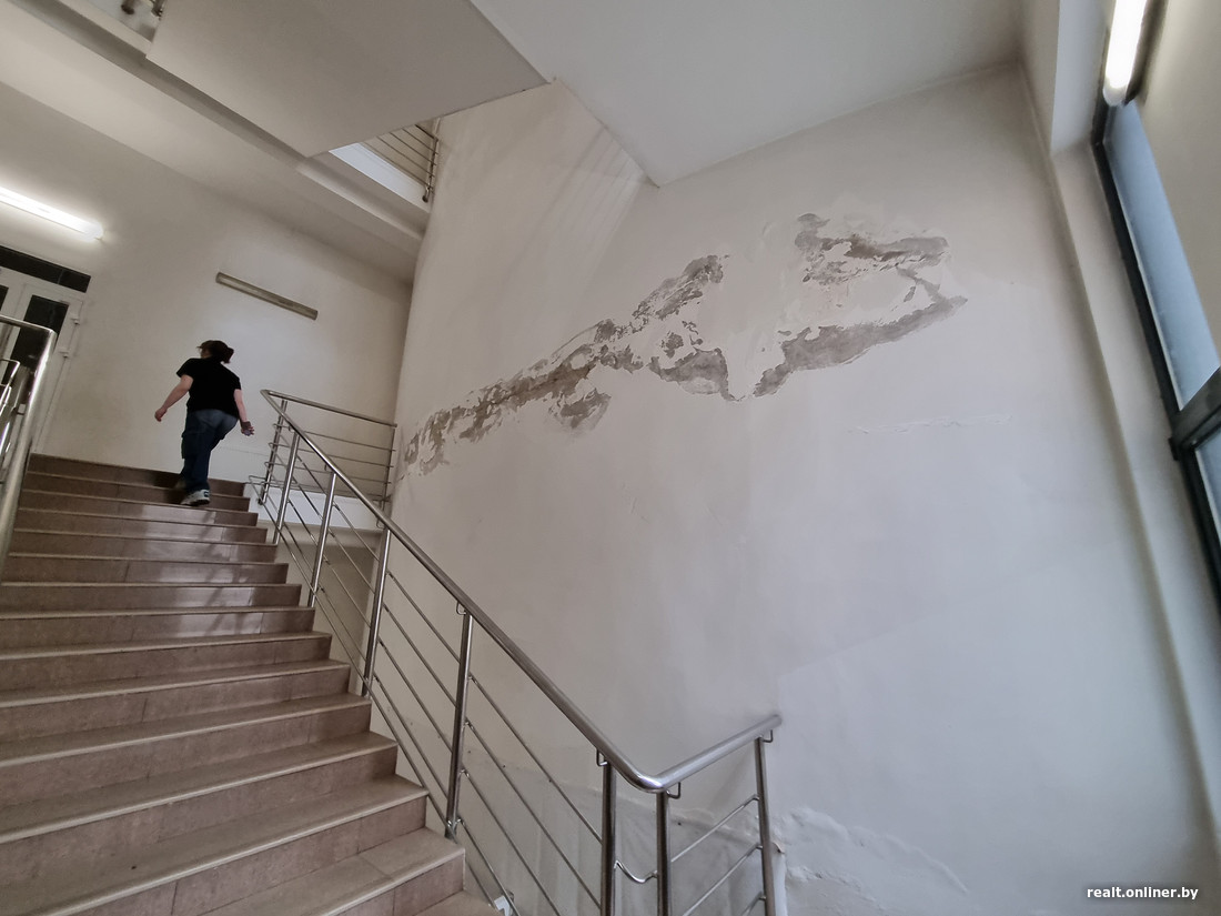 На одной из лестничных клеток поливало не хуже, чем на улице. Как это возможно в здании с крышей и стенами — загадка.