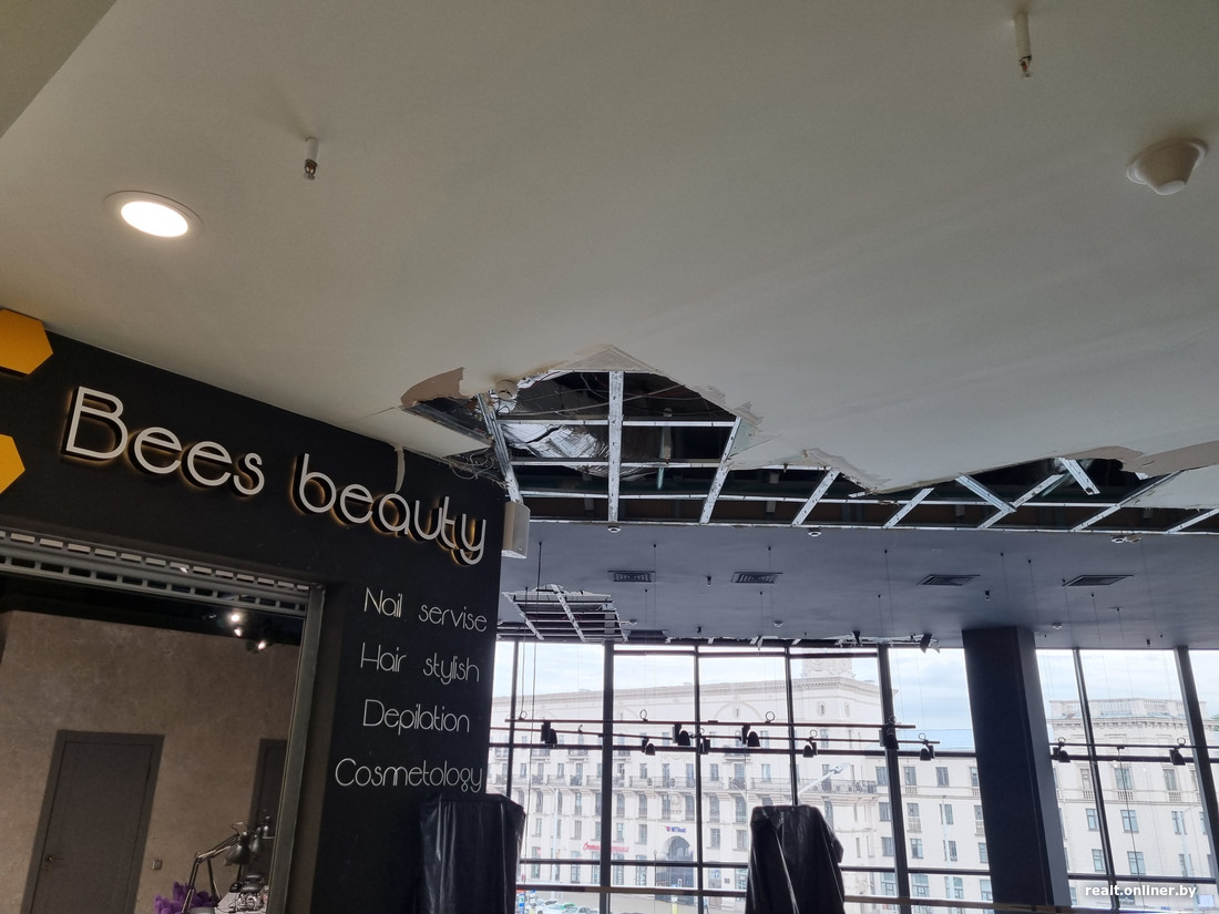 Одному из наших читателей даже удалось заснять момент, как в «Васильках» под напором воды обвалился декоративный потолок. Произошло это примерно в 20:30. «Сначала просто была вода на полу, люди даже продолжали сидеть и есть, а потом с потолка их начало обдавать водой, как из бочки. Ну и потом уже потолок не выдержал», — описал произошедшее минчанин.