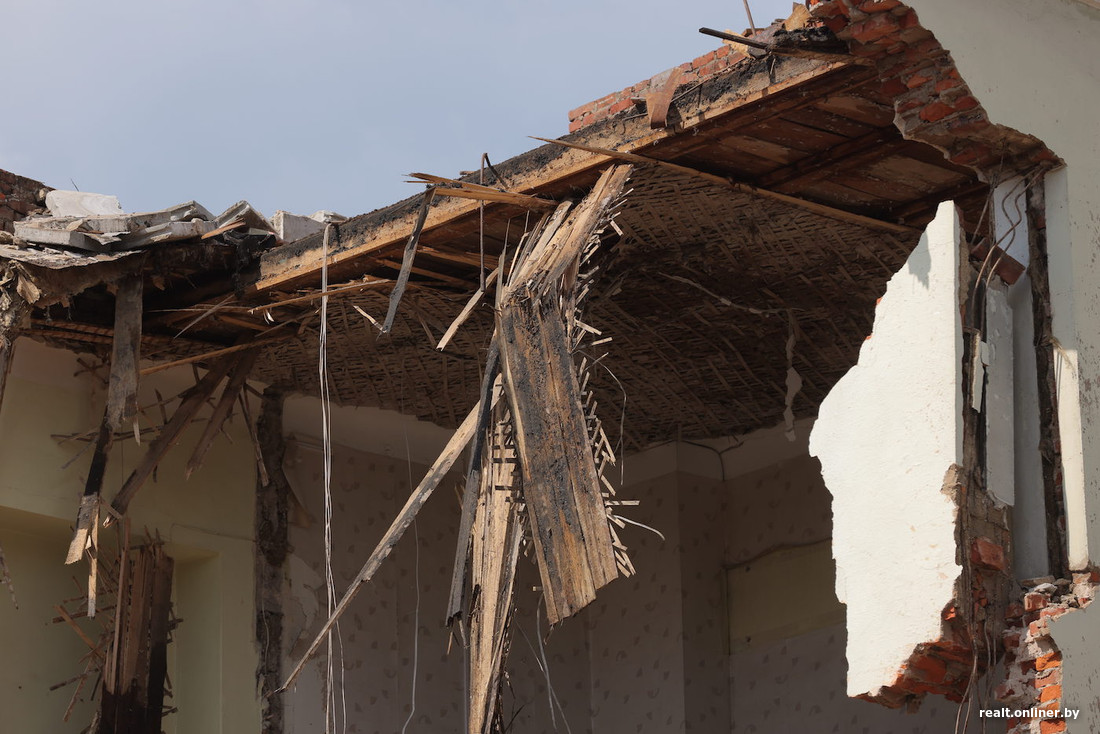 С самого утра на объекте все громыхает и падает. Причем с задачей разобрать здание на кусочки прекрасно справляется всего один экскаватор. Да это и не удивительно: как оказалось, старые деревянные перекрытия только тронь. С кирпичными стенами, конечно, посложнее, но темп все равно ударный.
