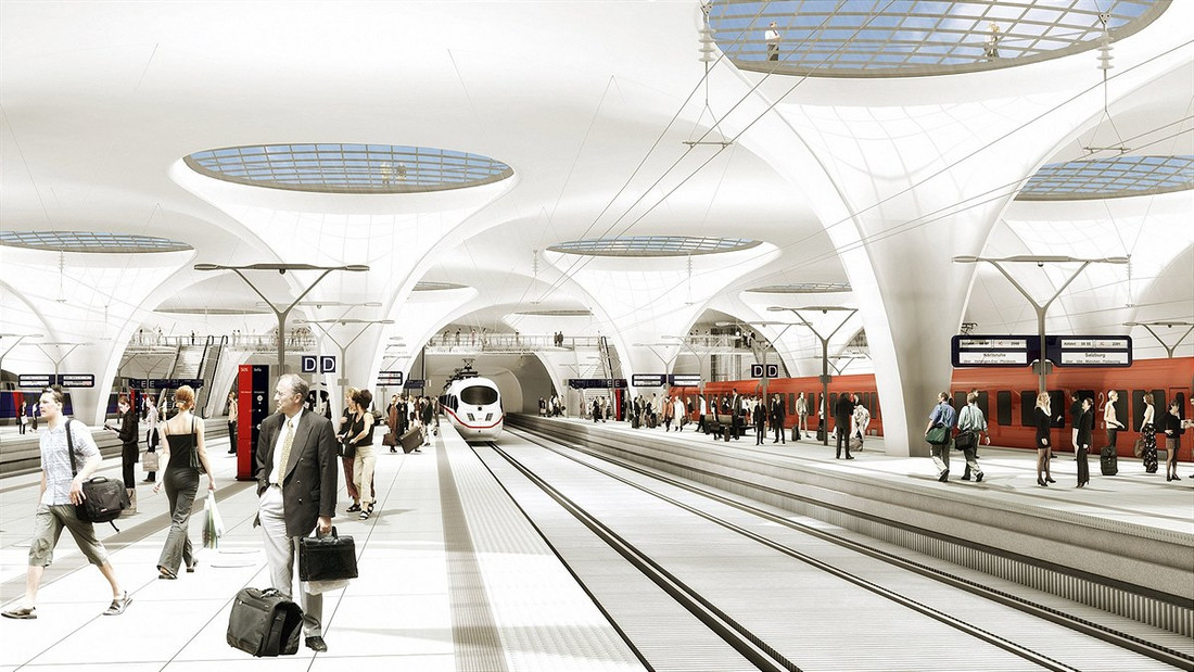 Во многих случаях провести такую реконструкцию расположенного в центре вокзала просто физически невозможно или это баснословно дорого, поэтому зачастую станции высокоскоростных магистралей, обслуживающие мегаполисы, строят в чистом поле где-то на окраине. В данном случае тевтонский инженерный гений нашел решение, позволяющее сохранить преимущества географического расположения станции. Правда, как показало будущее, он жестоко просчитался в оценке затрат на это.