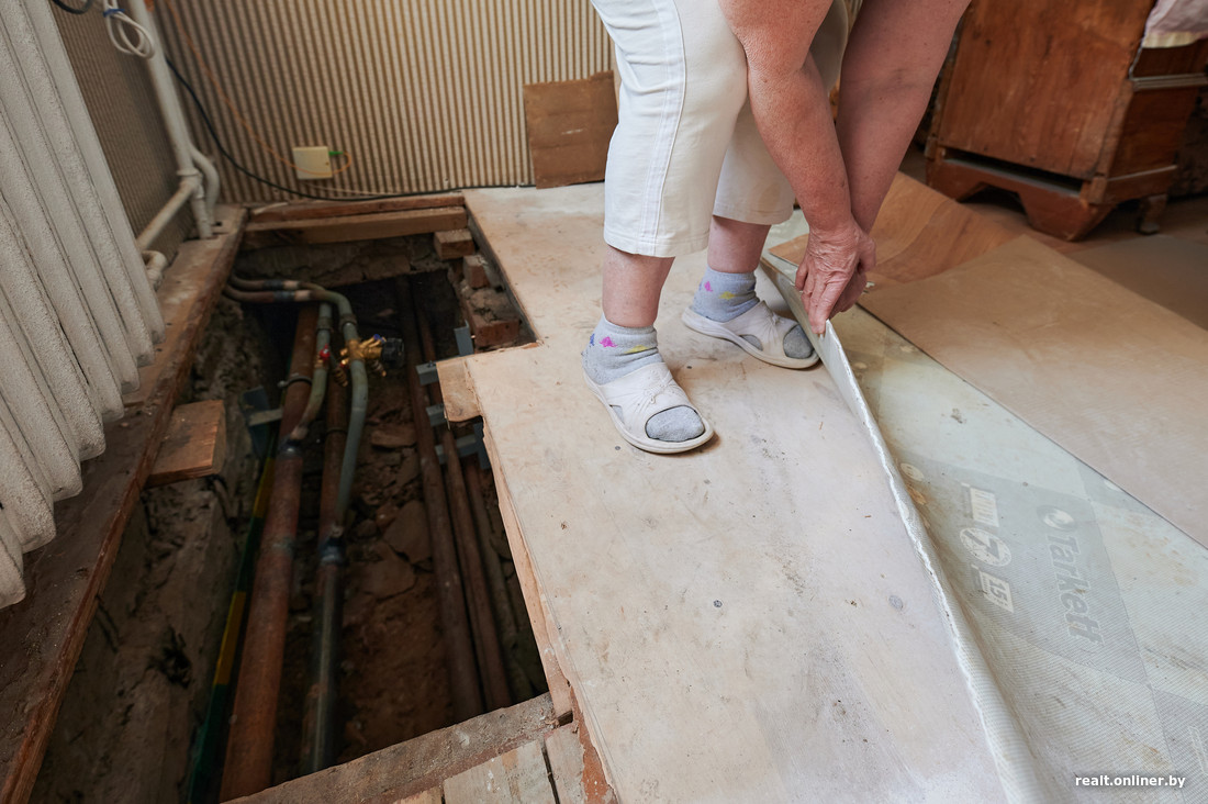 Семье Беллы и Михаила повезло даже меньше остальных. Из-за отсутствия подвала в доме коммуникации проложены прямо под полом их небольшой трешки на первом этаже. Для замены труб пол в некоторых комнатах пришлось взрывать, другого выхода у строителей не было.