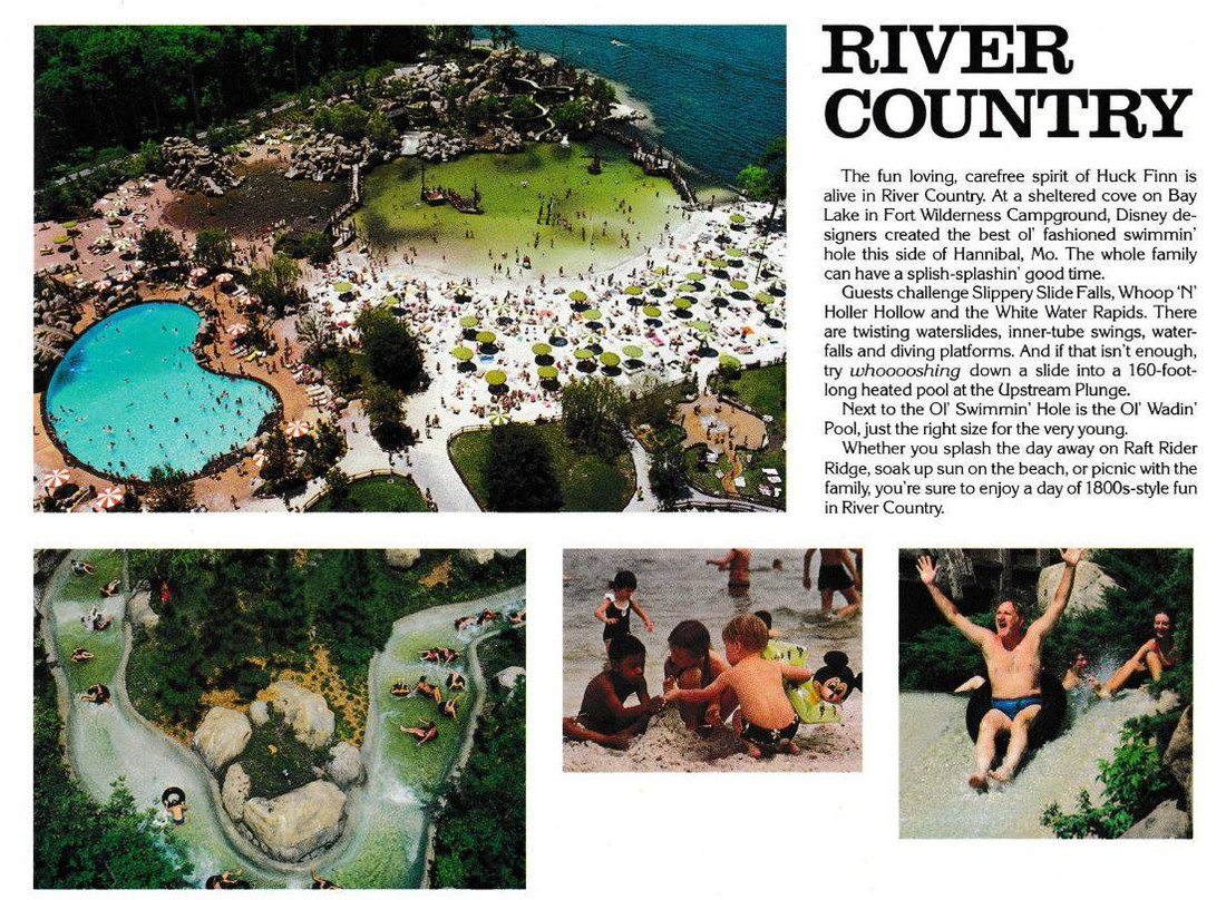 Наконец, хайкингу — пешим прогулкам по специальном созданным тропам. Еще одним элементом Fort Wilderness стал первый диснеевский аквапарк, который и получил название «Речная страна Диснея». Он заработал 20 июня 1976 года, через пять лет после открытия «Диснейуорлда». Первым его гостем стала 18-летняя дочь тогдашнего президента США Джеральда Форда Сьюзан.