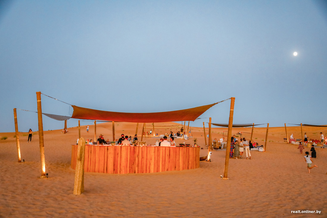 Вечером я помчалась в пустыню встречать закат. Из города ехать около 40 минут, потом еще минут 10 нужно петлять по барханам на джипах. И вот ты оказываешься в пустынном лагере Sonara Camp. Здесь можно поваляться на мягких диванах в ожидании еды и напитков, прокатиться на верблюде (мне их тревожить не хотелось, так что я просто наблюдала за ними со стороны), заняться серфингом по песчаным горкам или пострелять из лука… А можно просто понаблюдать за пустыней. Из-за того что в Дубае накануне были серьезные ливни, она сильно позеленела. Такого я еще не видела!