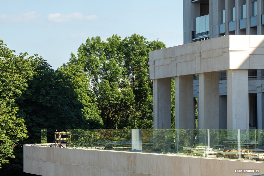 И все же по сравнению с весной 2023-го, когда мы изучали стройку, прогресс очевиден. Фасады оделись в бежевый и полностью остеклены, «зашит» огромными затонированными стеклопакетами будущий ресторан (уже сейчас можно представить, какие шикарные виды из него будут открываться), монтируется ограждение балконов и террас.