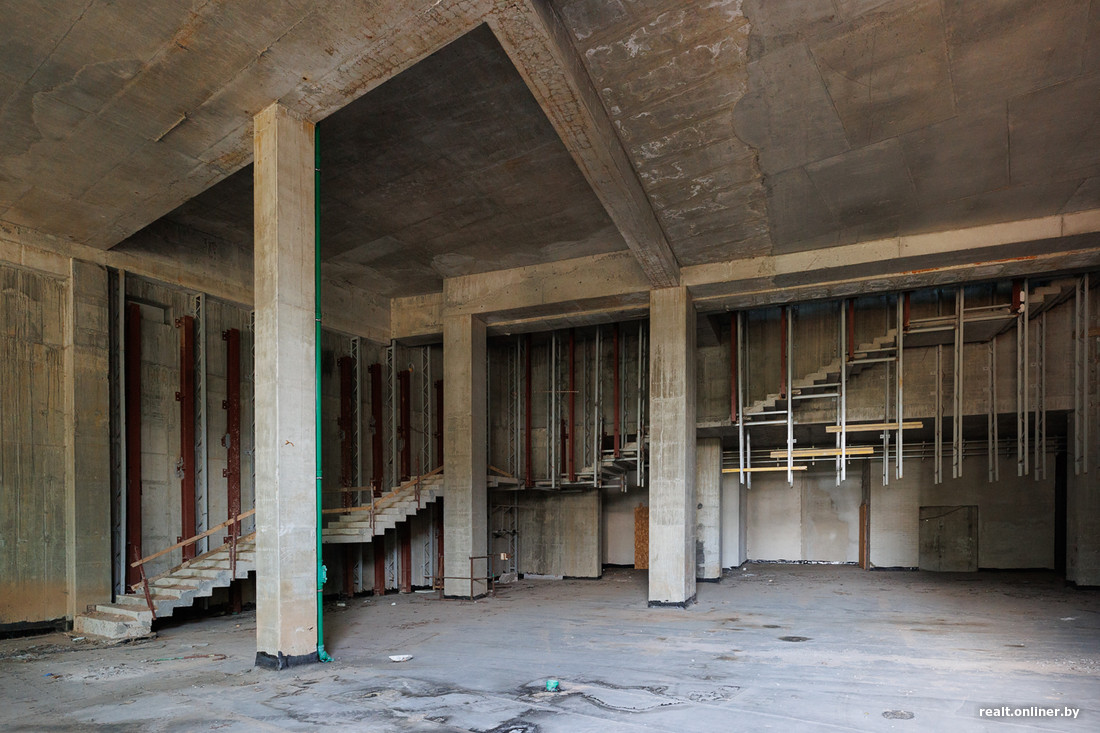 Сейчас в здании, доставшемся новому застройщику с 70% готовностью, происходит демонтаж. Сперва нужно снести все перегородки из гипсокартона, которые превратили этажи в длинные коридоры. После на их месте возведут новые стены, но уже из керамзитобетонных блоков.