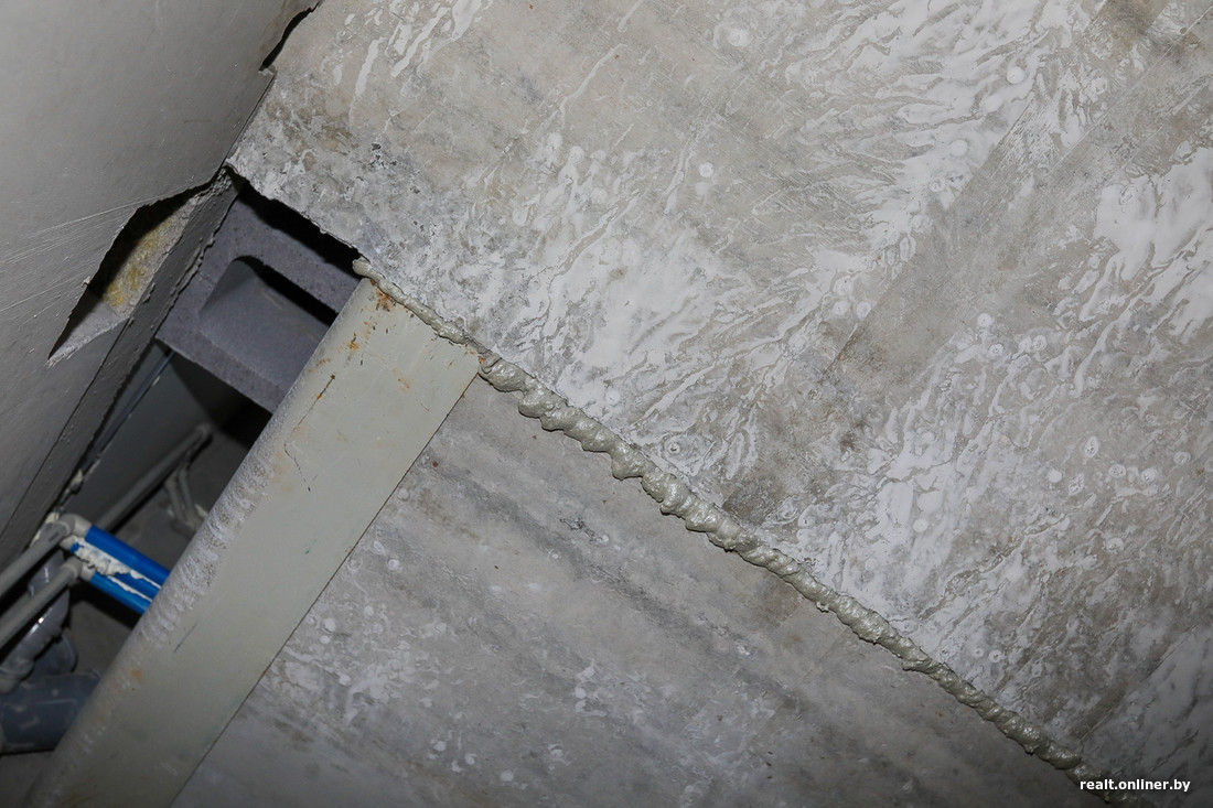 Еще не совсем понимаю, для чего в швы между плитами перекрытия задута монтажная пена. По правилам русты заполняются составом с цементом. Так, например, сделано в гостиной. В санузле же почему-то по-другому, — недоумевает специалист.