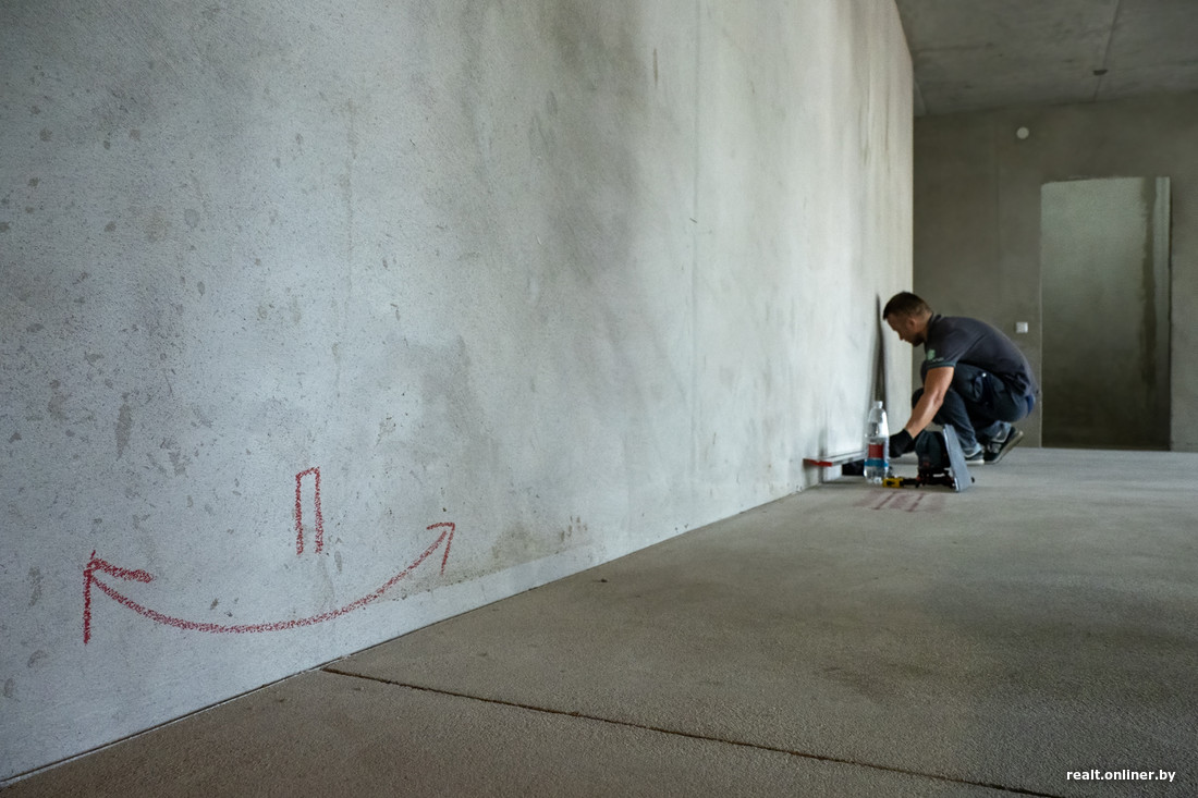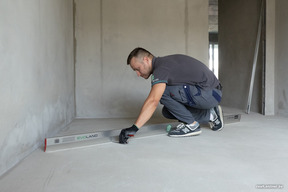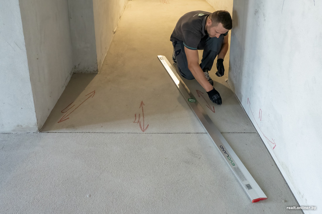 Стяжка хорошая: для такой площади результат достойный. Несколько бугорков, которые надо сошлифовать, и ямок, которые стоит подтянуть, я отметил. Это опять же точечная работа. Других моментов нет: стяжка не скрипит, не шевелится, все с ней в порядке, готова к укладке напольного покрытия, — показывает Дмитрий Смоленский из компании «Эво Лэнд».
