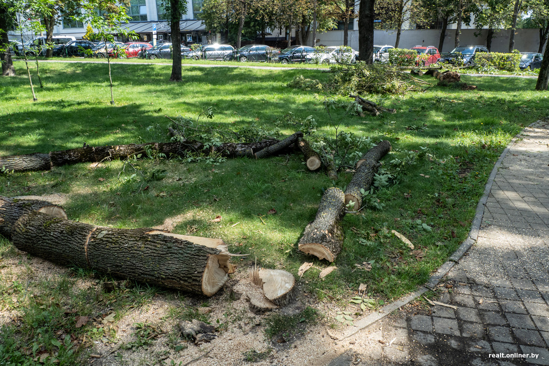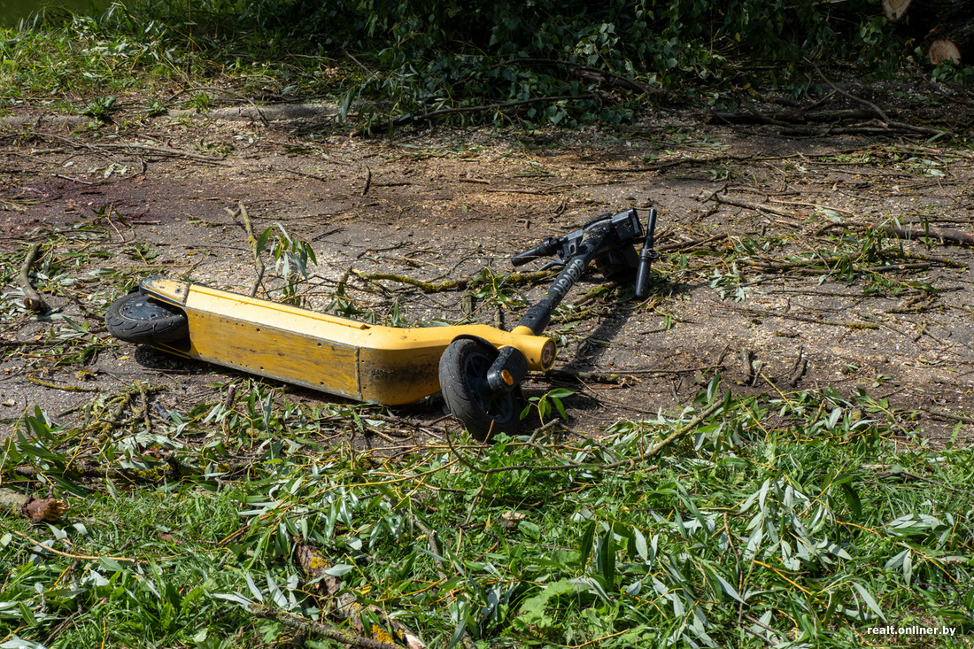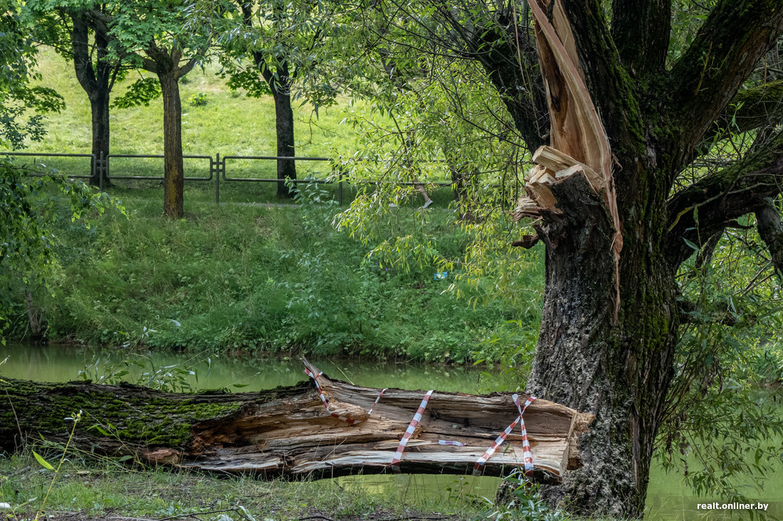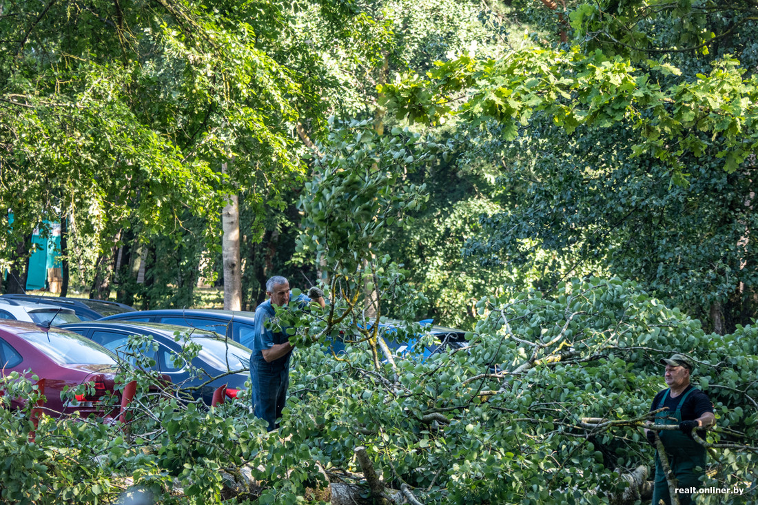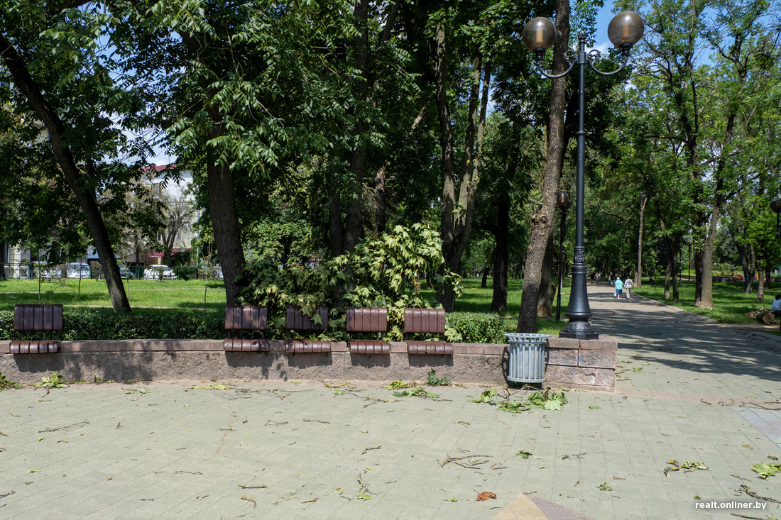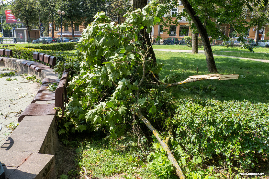 В субботу Минск накрыл настоящий ураган. Из-за стихии погибла девушка, пострадали машины, дома, детские площадки и продуктовые палатки. На следующий день фотограф Onlíner проехался по Минску и увидел, как выглядит город после разгула стихии.